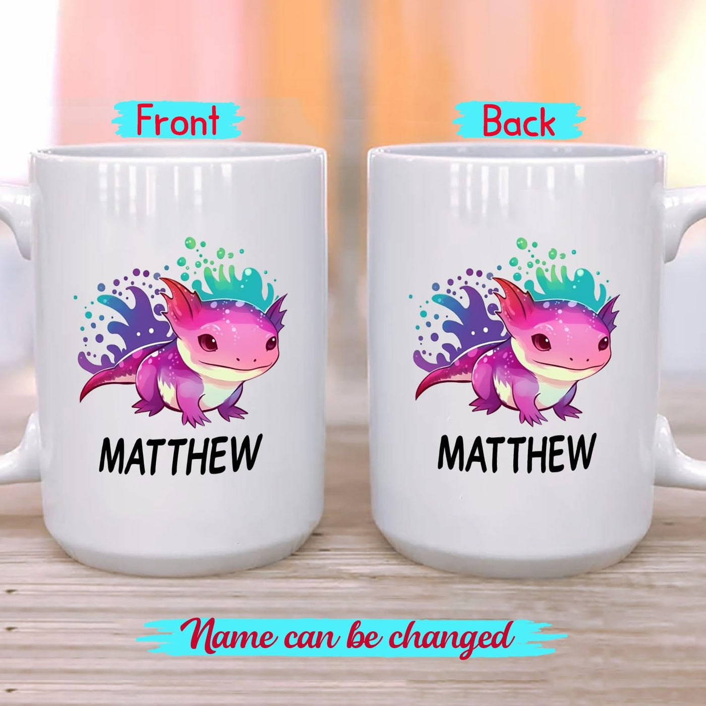 • Q: What is the size of the personalized Axolotl coffee mug? A: The personalized Axolotl coffee mug is available in two sizes: 11 ounces, which is the standard coffee mug size, and 15 ounces for those who prefer a larger cup.