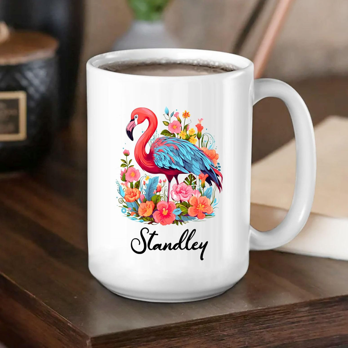 Personalized Name Flamingo White Ceramic Mug Gift For Dad Mom Sister Birthday, Customized Flamingo Lover Coffee Mug Cup 11 Oz 15