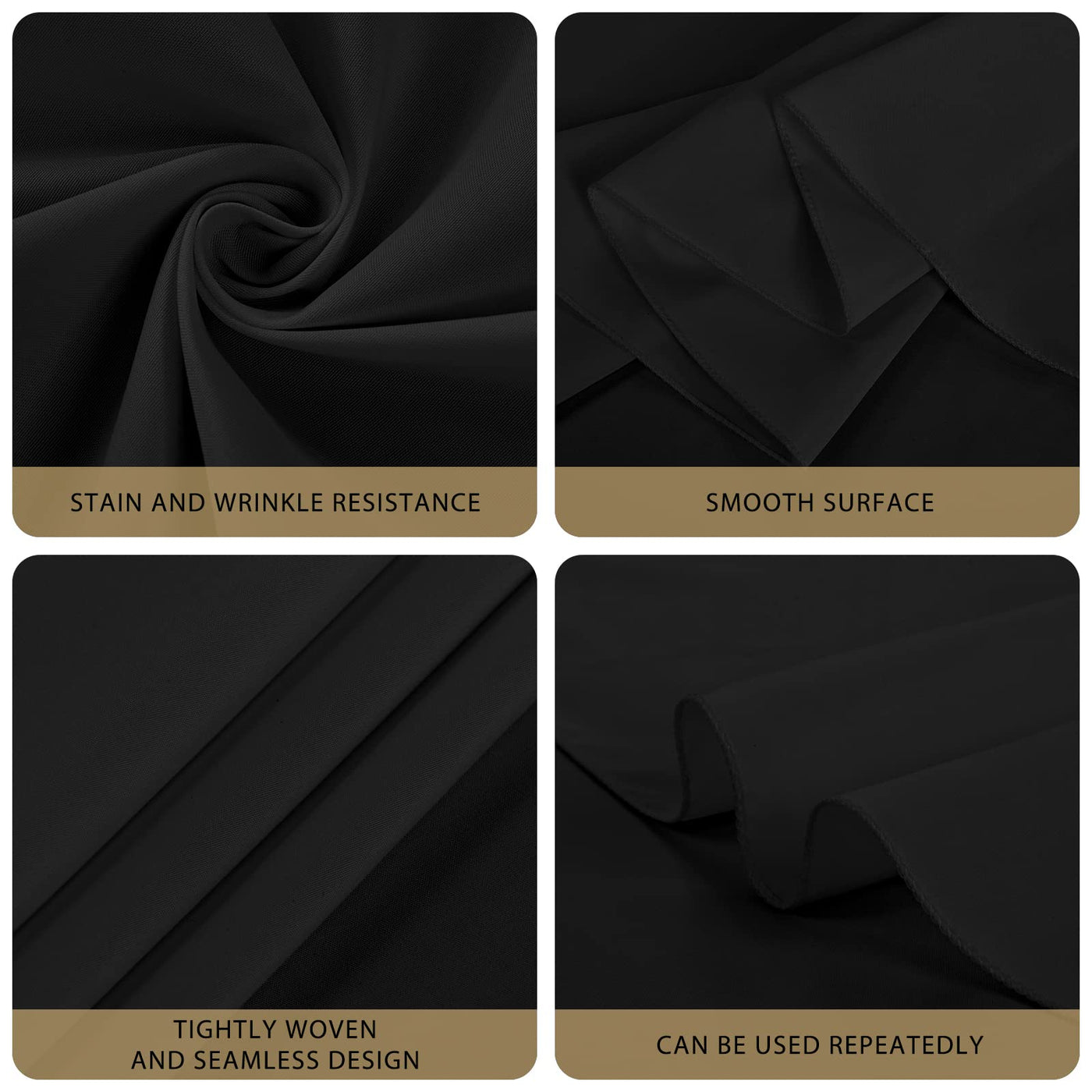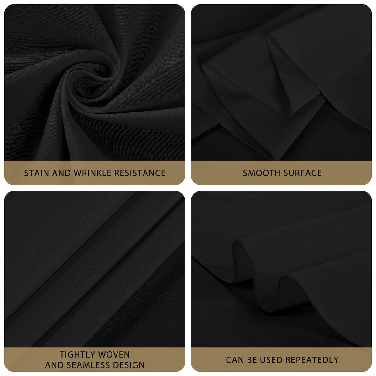 - Q: Do these tablecloths come in other colors or sizes? A: The provided details only mention black tablecloths in 120-inch size; other colors or sizes are not specified.