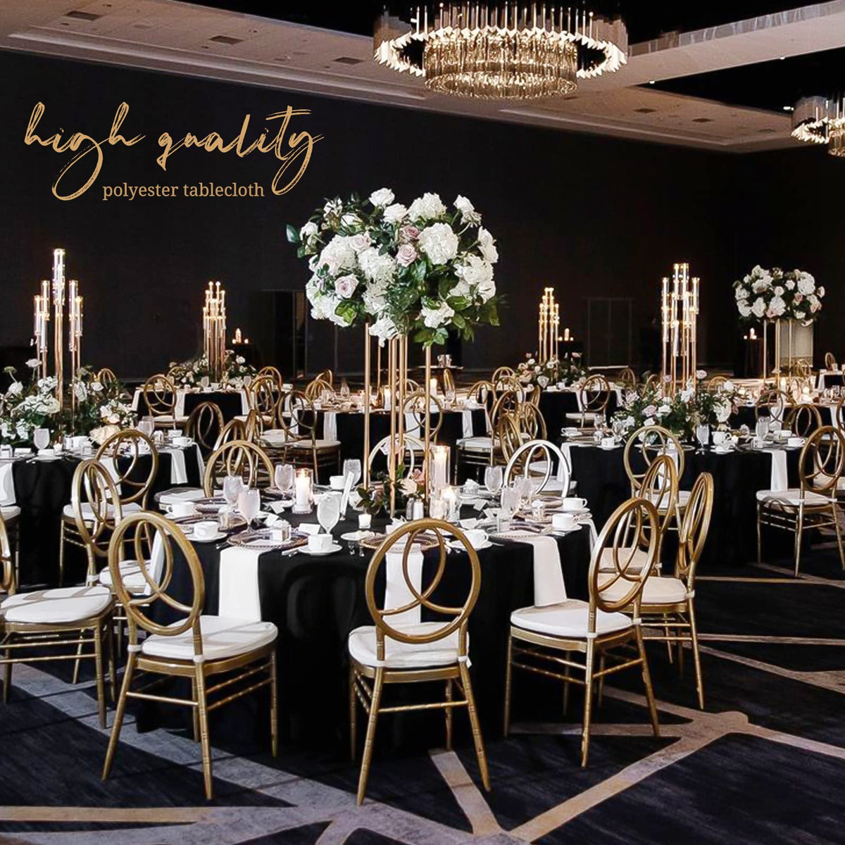 - Q: How many tablecloths are included in the pack? A: The pack includes eight 90-inch black round tablecloths.