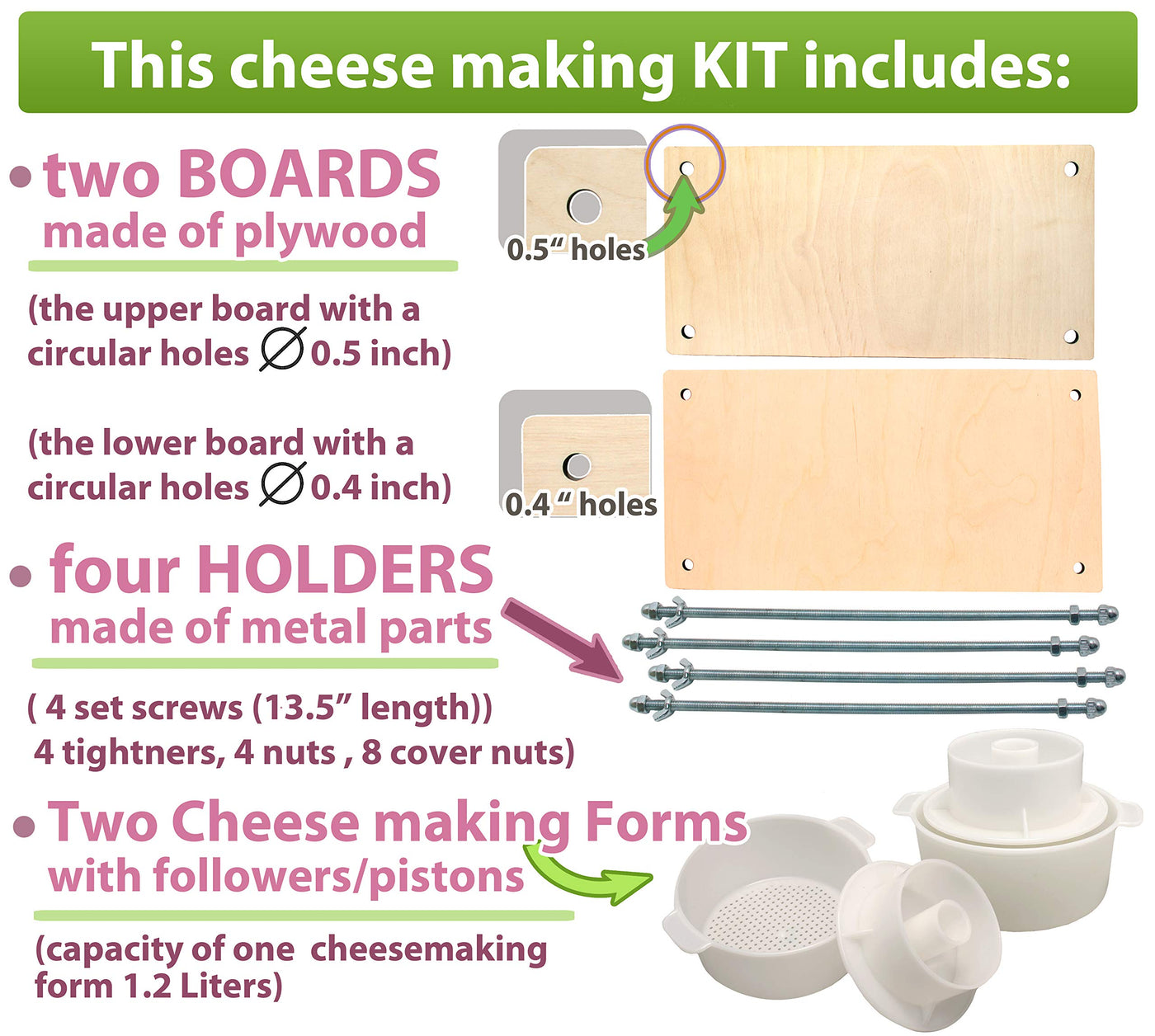 • Q: Does the product include cheese molds? A: Yes, the Wooden Cheese Press includes two cheese molds with a follower piston, each with a capacity of 1.3 quarts.