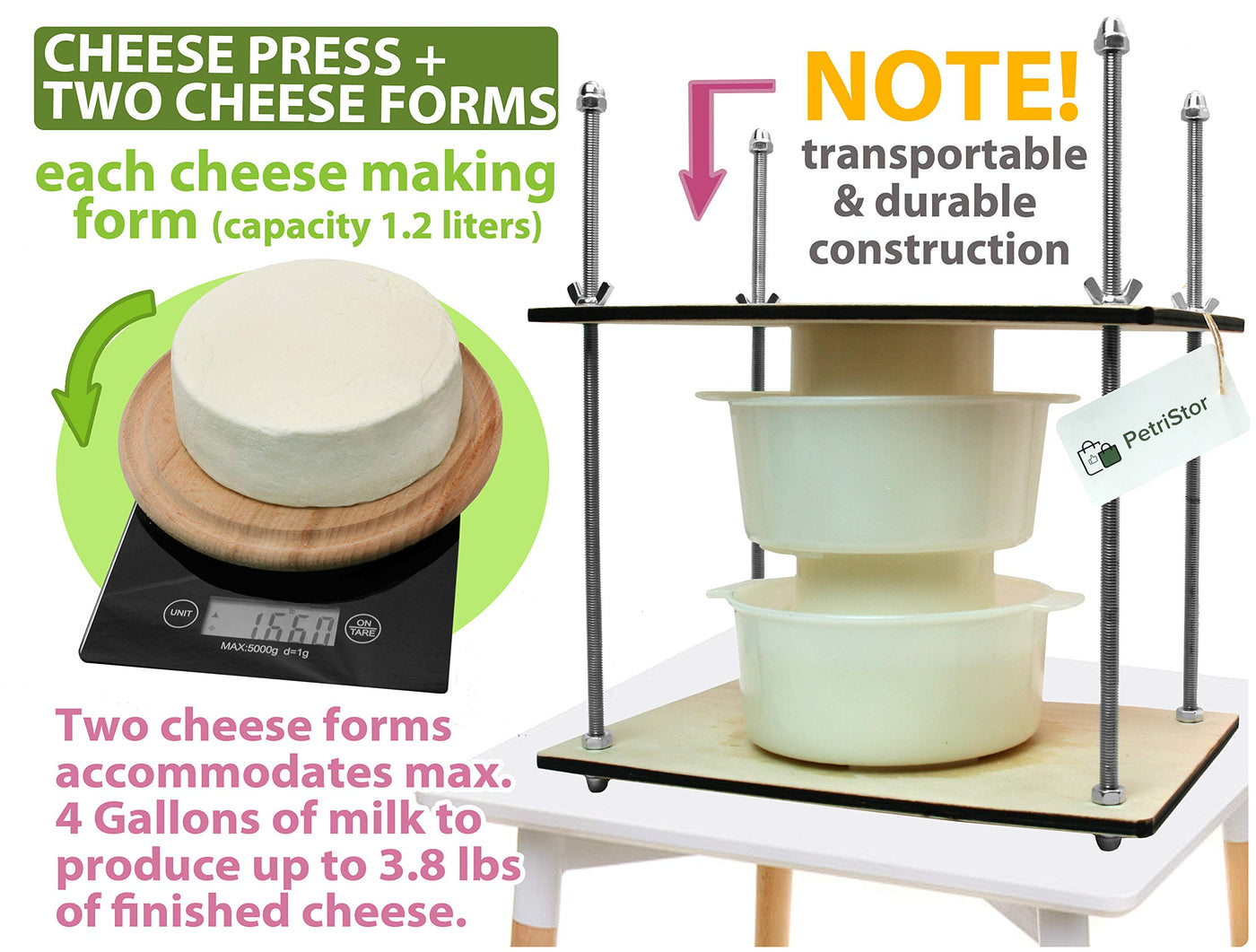 Petristor Wooden Cheese Press For Cheese Making Supplies 12In Metal Guides 13In And 2 Cheese Mold With Follower Piston 1.3Qt - L