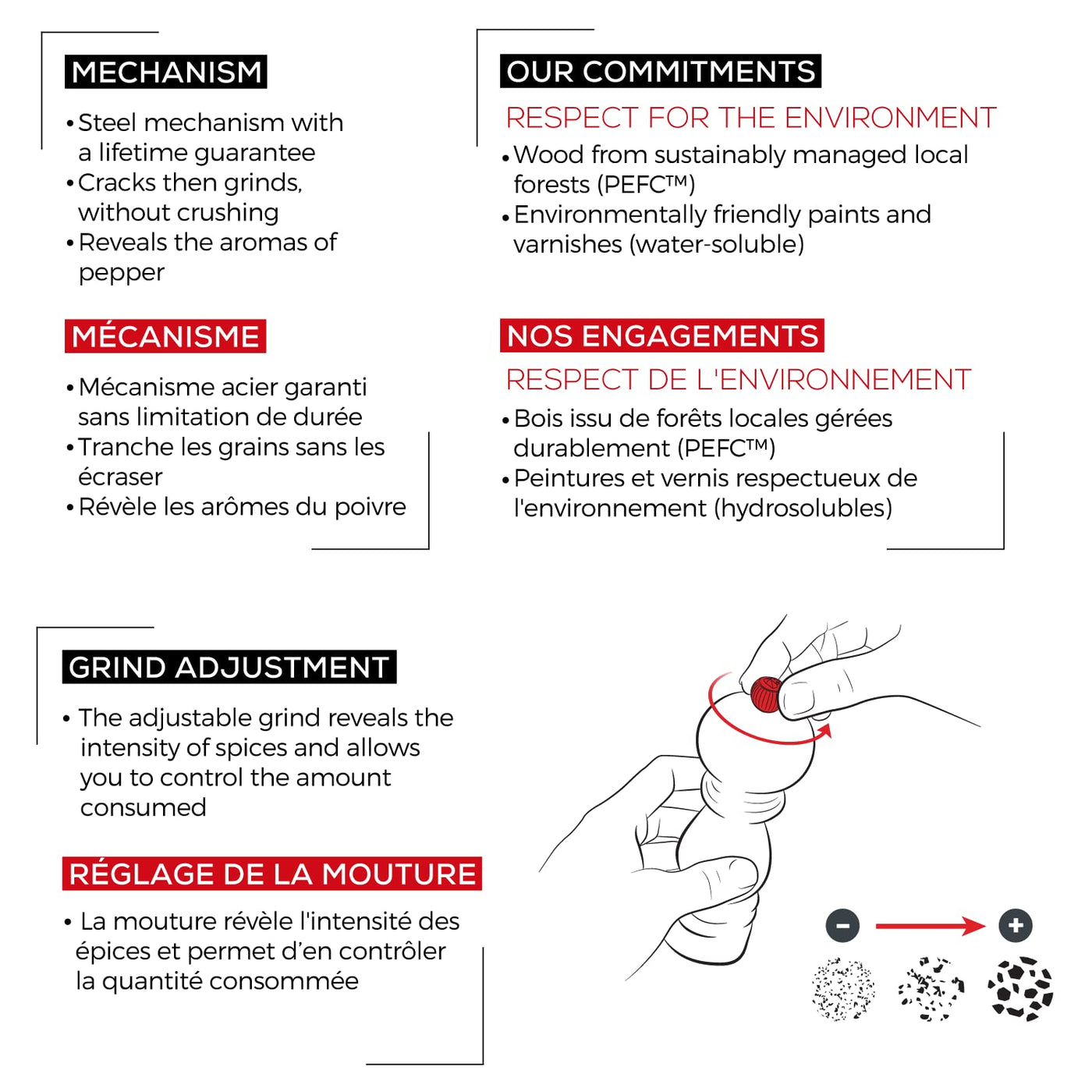 • Q: What is the grinding mechanism made of? A: The grinding mechanism of the Peugeot Paris Manual Pepper Mill is made from case-hardened steel, designed to resist corrosion and ensure longevity.
