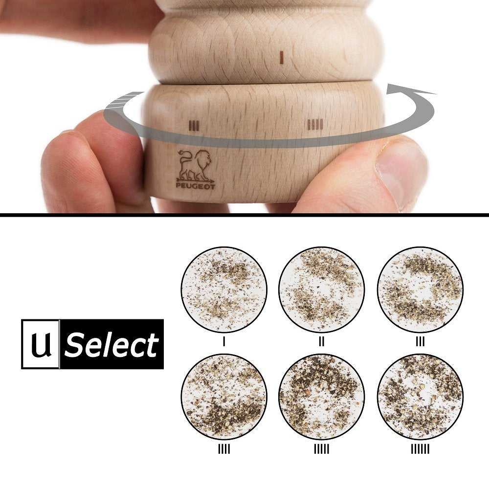 • Q: Is the grinding mechanism adjustable? A: Yes, the Peugeot U'Select mills feature an adjustable grinding mechanism, allowing you to choose between fine and coarse grinds for both pepper and salt.