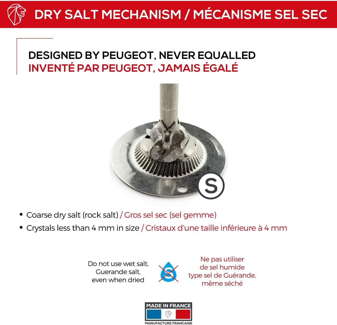 • Q: What is the warranty on the Peugeot salt mill? A: The Peugeot salt mill comes with a lifetime guarantee on the grinding mechanism, ensuring long-lasting quality and performance.
