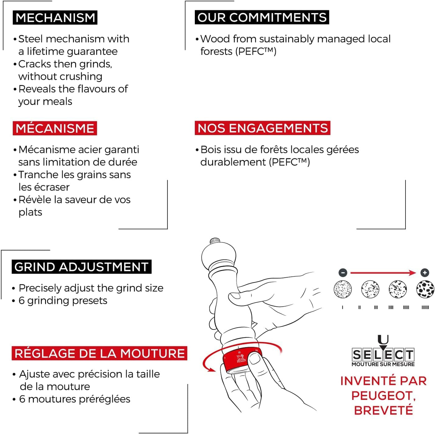 • Q: What materials are used in the Peugeot Paris u’Select Manual Salt Mill? A: The Peugeot Paris u’Select Manual Salt Mill is crafted from PEFC-certified beechwood, sourced from sustainably managed forests. It features a water-based anthracite grey finish with a metallic effect.