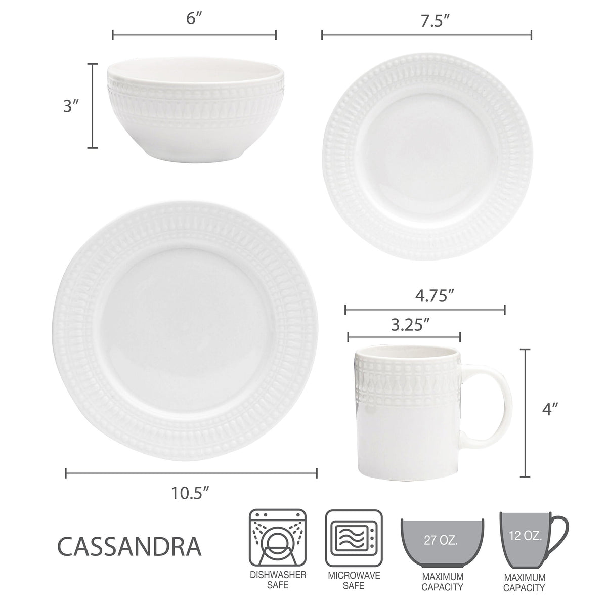 • Q: What is included in the Pfaltzgraff Cassandra 16-piece dinnerware set? A: The set includes 4 each of a 10-1/2 inch dinner plate, a 7-1/2 inch salad plate, a 6-inch soup/cereal bowl, and a 12-ounce mug, serving a total of 4 people.