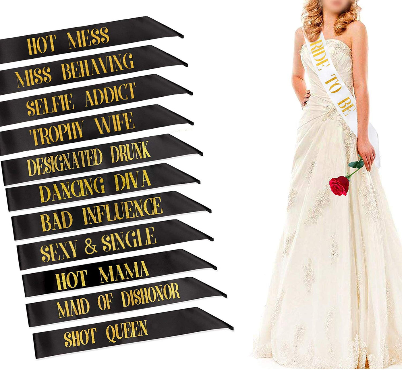 - Q: What phrases are on the black sashes? A: The black sashes feature the following phrases: MAID OF DISHONOR, SHOT QUEEN, DANCING DIVA, BAD INFLUENCE, DESIGNATED DRUNK, MISS BEHAVING, SEXY & SINGLE, HOT MESS, TROPHY WIFE, SELFIE ADDICT, and HOT MAMA.