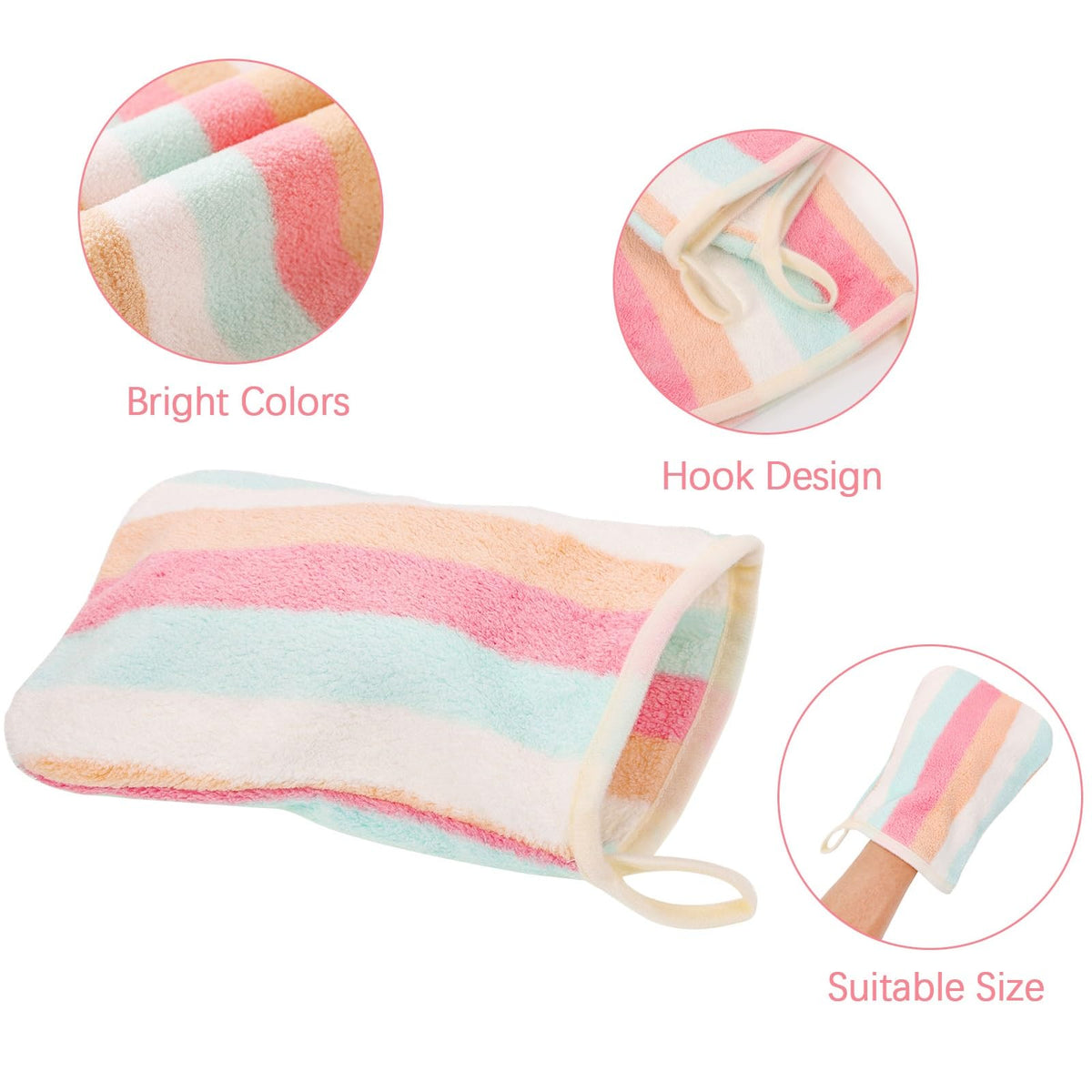 - Q: Do the washcloths come with any special features? A: Yes, they feature a loop for easy hanging and drying, and they are designed in pastel rainbow stripes for a colorful touch.