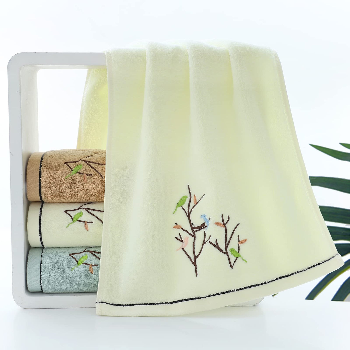 Pidada Hand Towels Set of 2 Embroidered Bird Tree Pattern 100% Cotton Absorbent Soft Decorative Towel for Bathroom 13.8 x 29.5 Inch (Light Yellow)