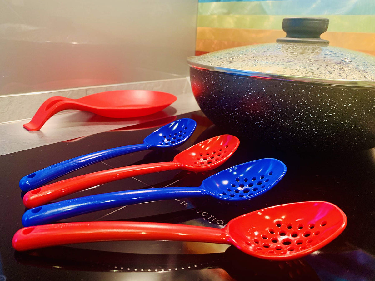 • Q: What colors are available for the Pikanty serving spoons? A: The Pikanty slotted serving spoons are available in vibrant Red and Blue colors, adding a pop of color to your kitchen.