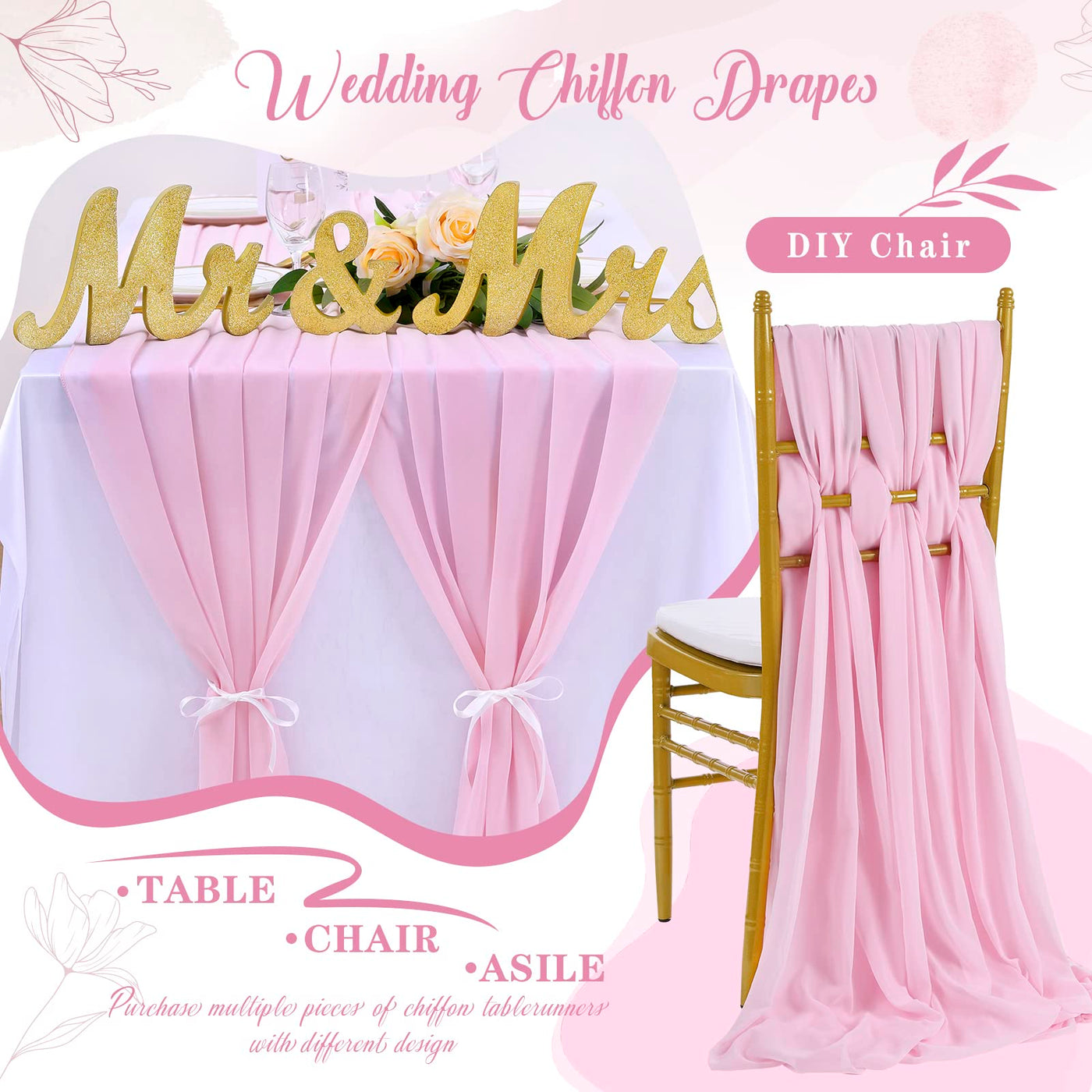 - Q: How many pieces are included in the package? A: The package includes 10 pieces of Pink Chiffon Table Runners and 20 ribbon ties for securing the fabric.
