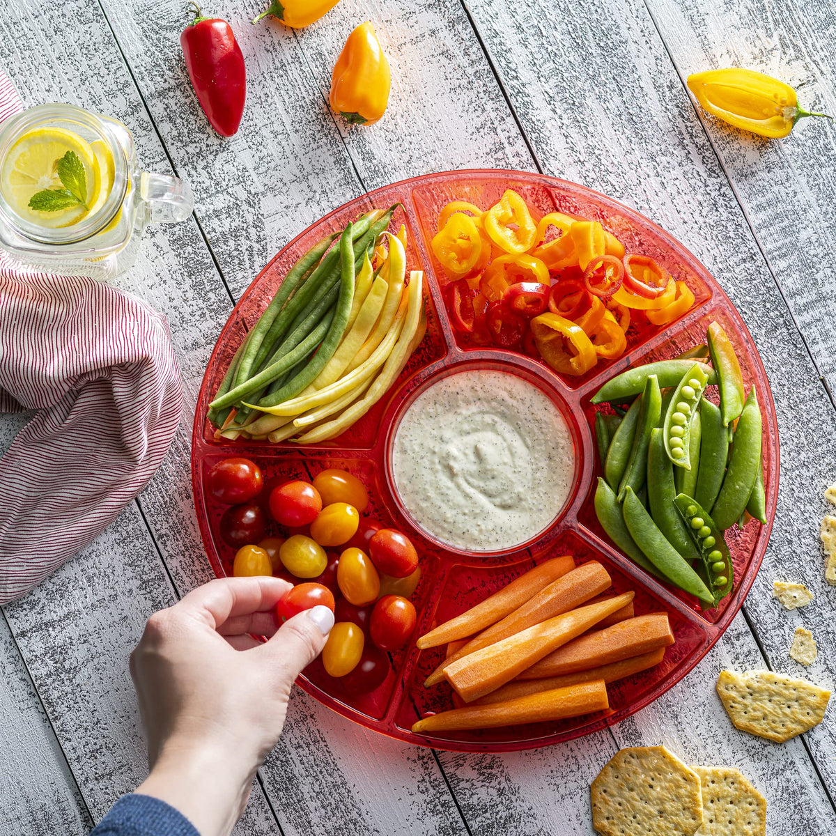 • Q: Can the serving tray be used for hot foods? A: The tray is designed primarily for cold foods like snacks, dips, and vegetables; it is not recommended for hot foods.