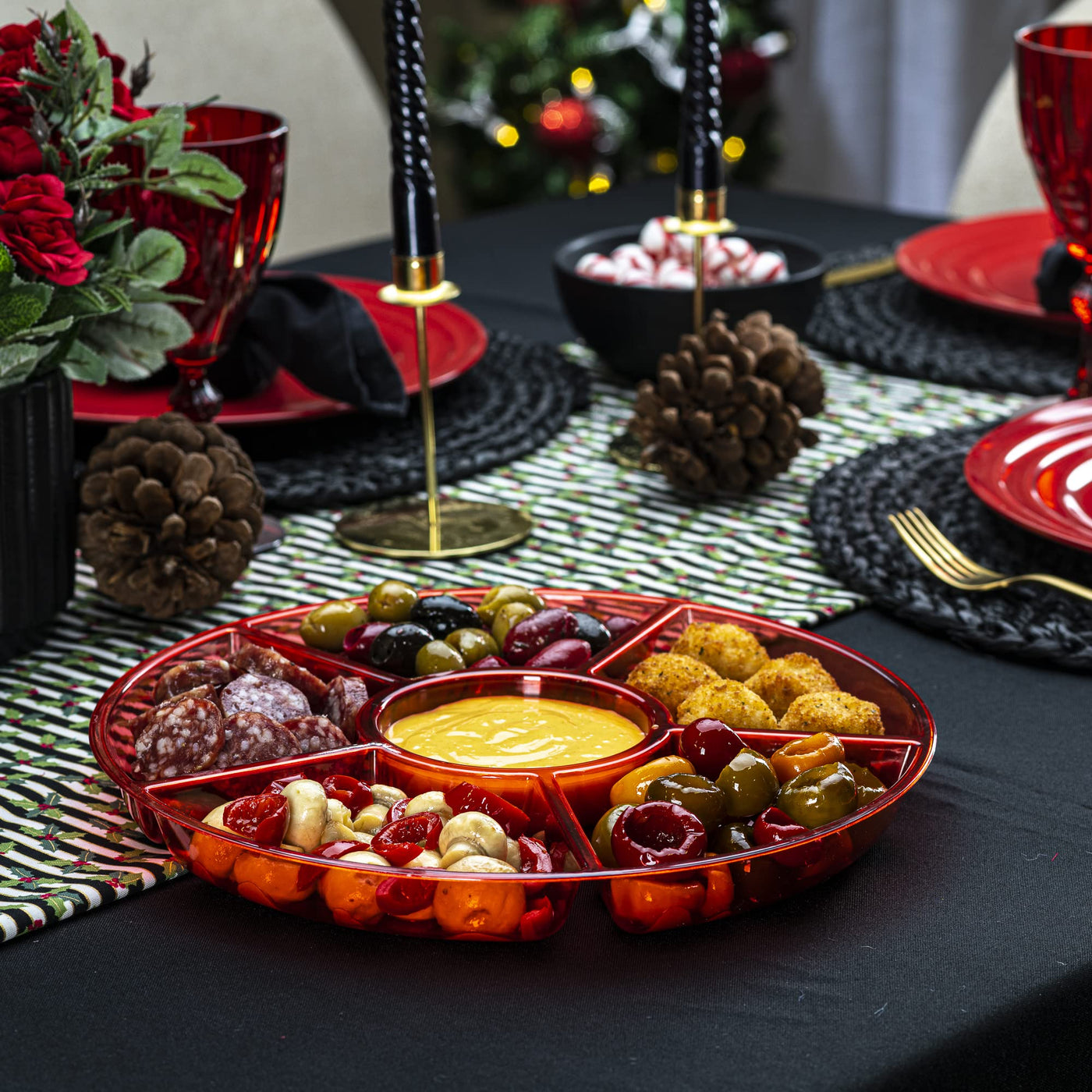 • Q: How many sections does the tray have? A: The tray features 6 divided sections along with a center dip section, ideal for serving snacks and appetizers.