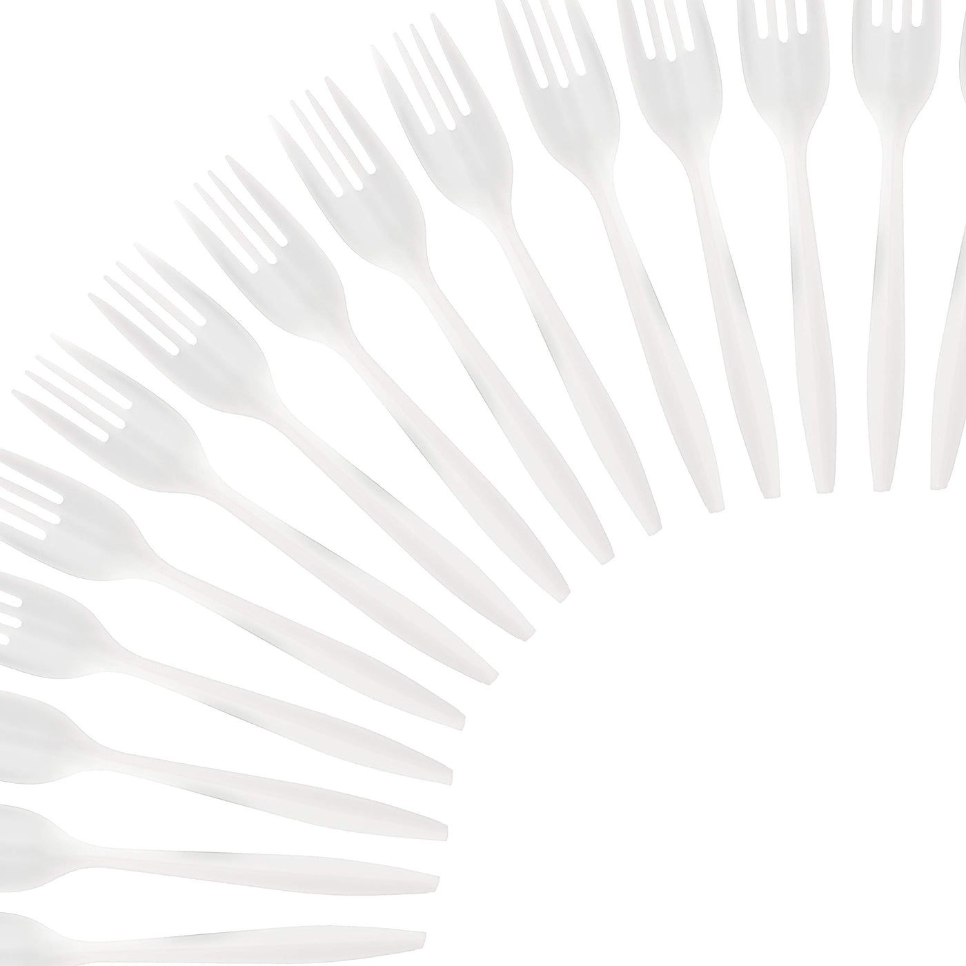 • Q: How many forks are included in one box? A: Each box contains 400 medium-weight white disposable plastic forks, providing ample cutlery for gatherings.