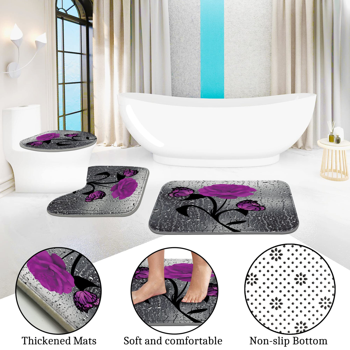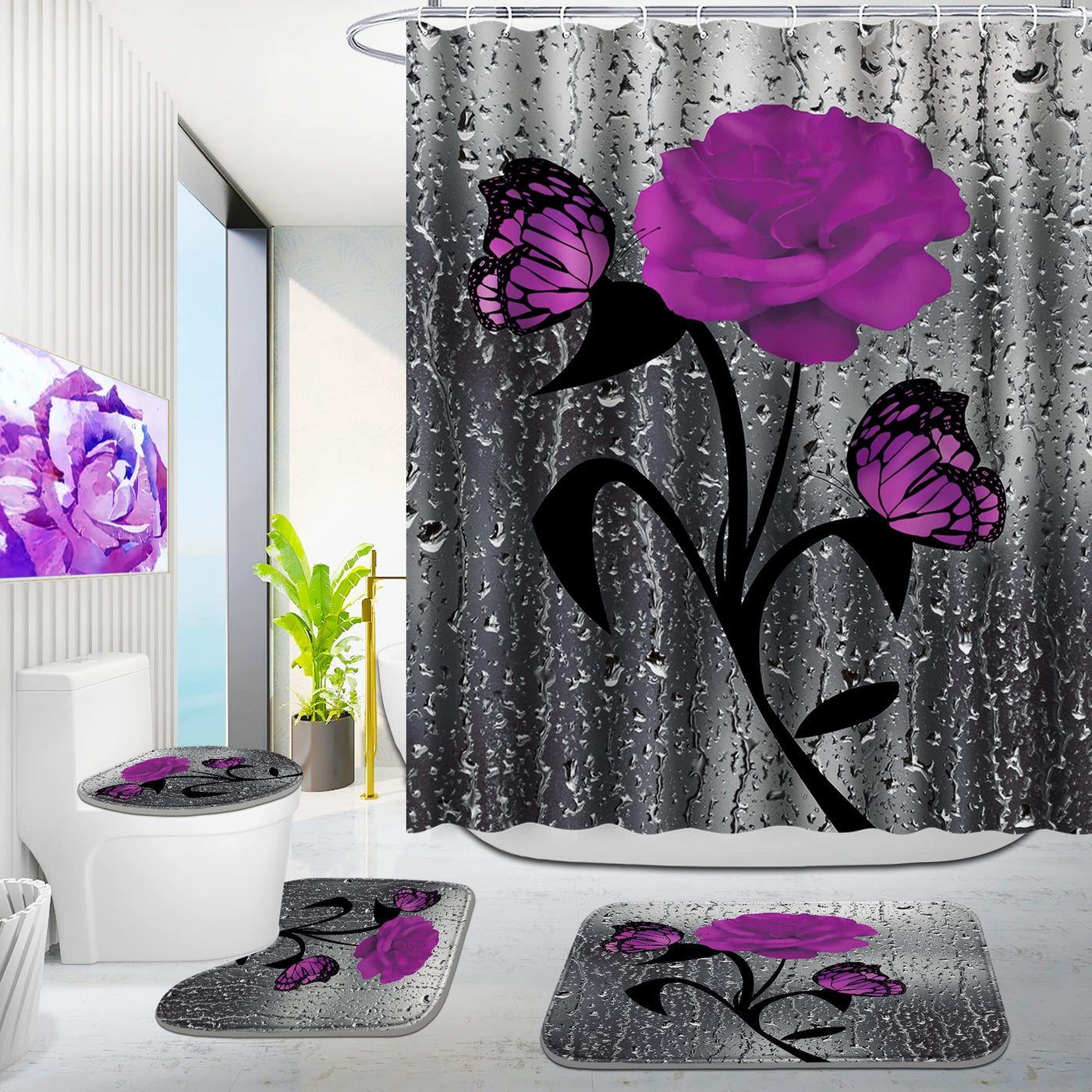 Poedist 4 Pcs Bathroom Shower Curtain Set,Purple Rose Valentine'S Day Shower Curtain Sets With Rugs(Bath Mat,U Shape And Toilet