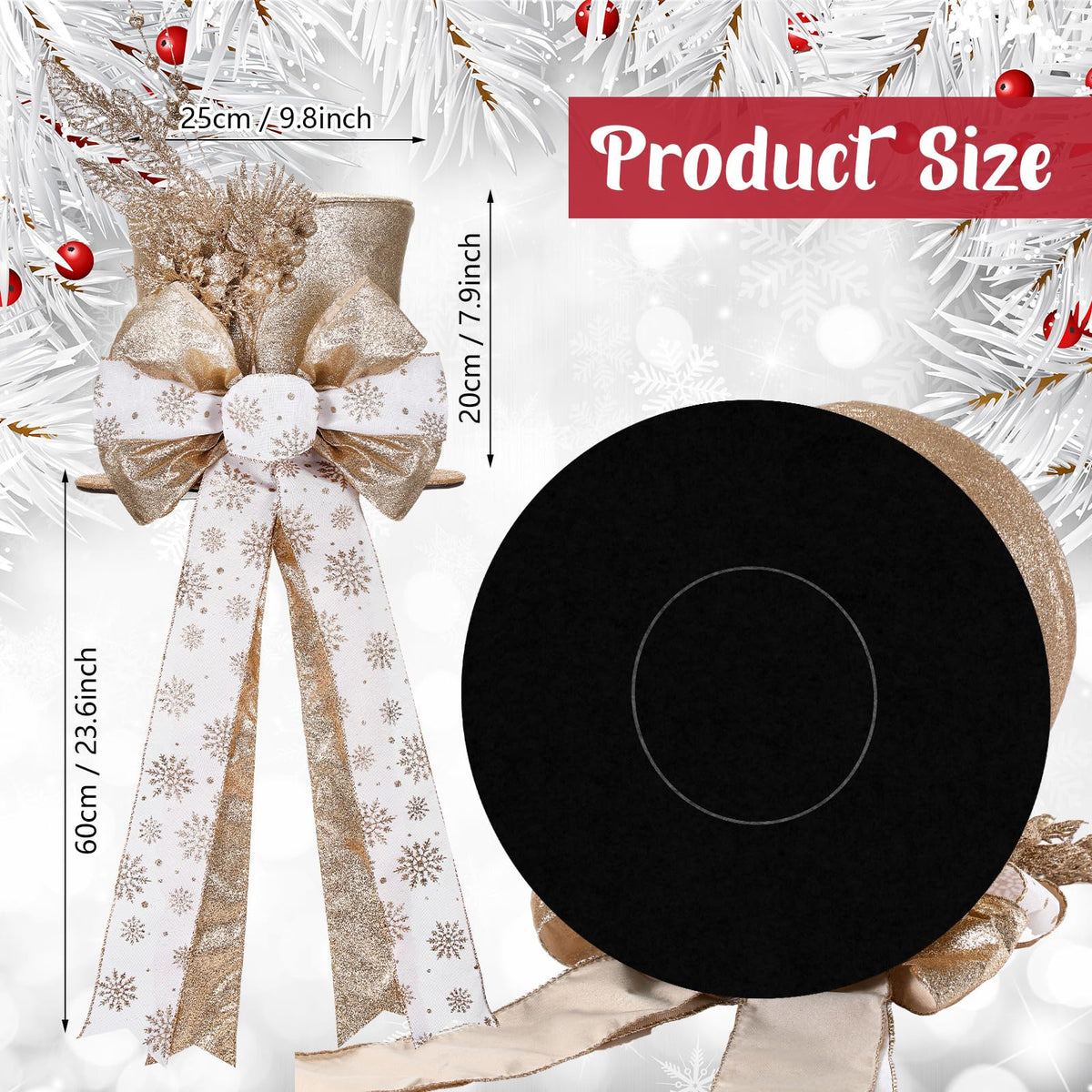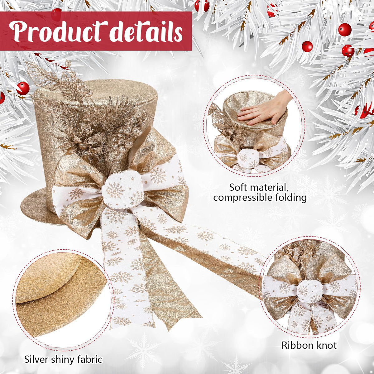 Features: Our gold Christmas tree topper is not limited to just your tree. This versatile piece can also decorate your tables, offices, bars, hotel and restaurant spaces, even doubling as a snowman hat. Place it on window displays, Christmas trees, or tables to add a unique holiday touch, injecting cheer and excitement into any area. Featuring a shiny gold top hat decoration, this Xmas tree topper is suitable for Christmas, Thanksgiving, New Year, and winter themed parties. It adds a festive atmosphere, making it the ideal holiday gift for partners and family, or as a special holiday treat for yourself. Let this stylish decoration make your holiday events unforgettable. Specifications: Material: scallion fabric, velvet cloth, organza Color: gold Size: Hat: about 7.9 inches high, 9.8 inches wide Ribbon: about 23 inches/ 60 cm long Package includes: 1 x Christmas tree topper hat Notes: Manual measurement, please allow slight errors on size. The color may exist a slight difference due to different screen displays.