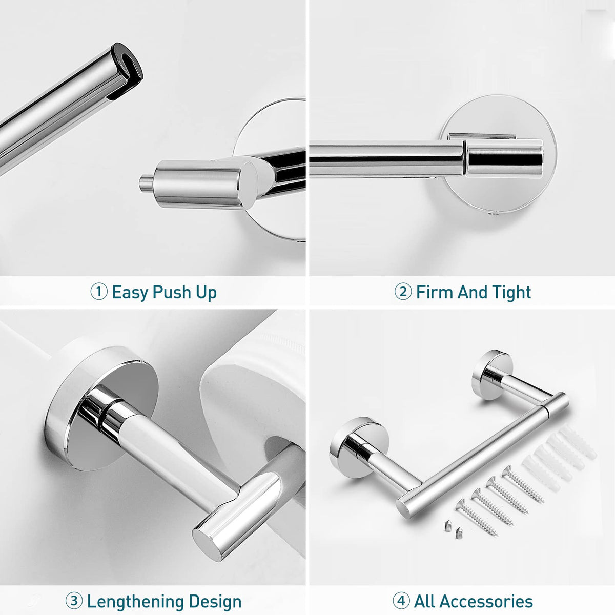 - Q: What size toilet paper rolls can this holder accommodate? A: The POKIM Chrome Toilet Paper Holder can accommodate standard and mega toilet paper rolls, with a rod length of 5.51 inches and holder feet length of 2.44 inches.