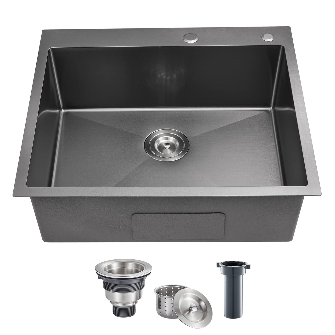 Popfly 25 Inch Drop In Kitchen Sink, 25X18 Stainless Sink Drop-In Black Topmount Bar Sink, 9 Inch Deep 18 Gauge Single Bowl Over
