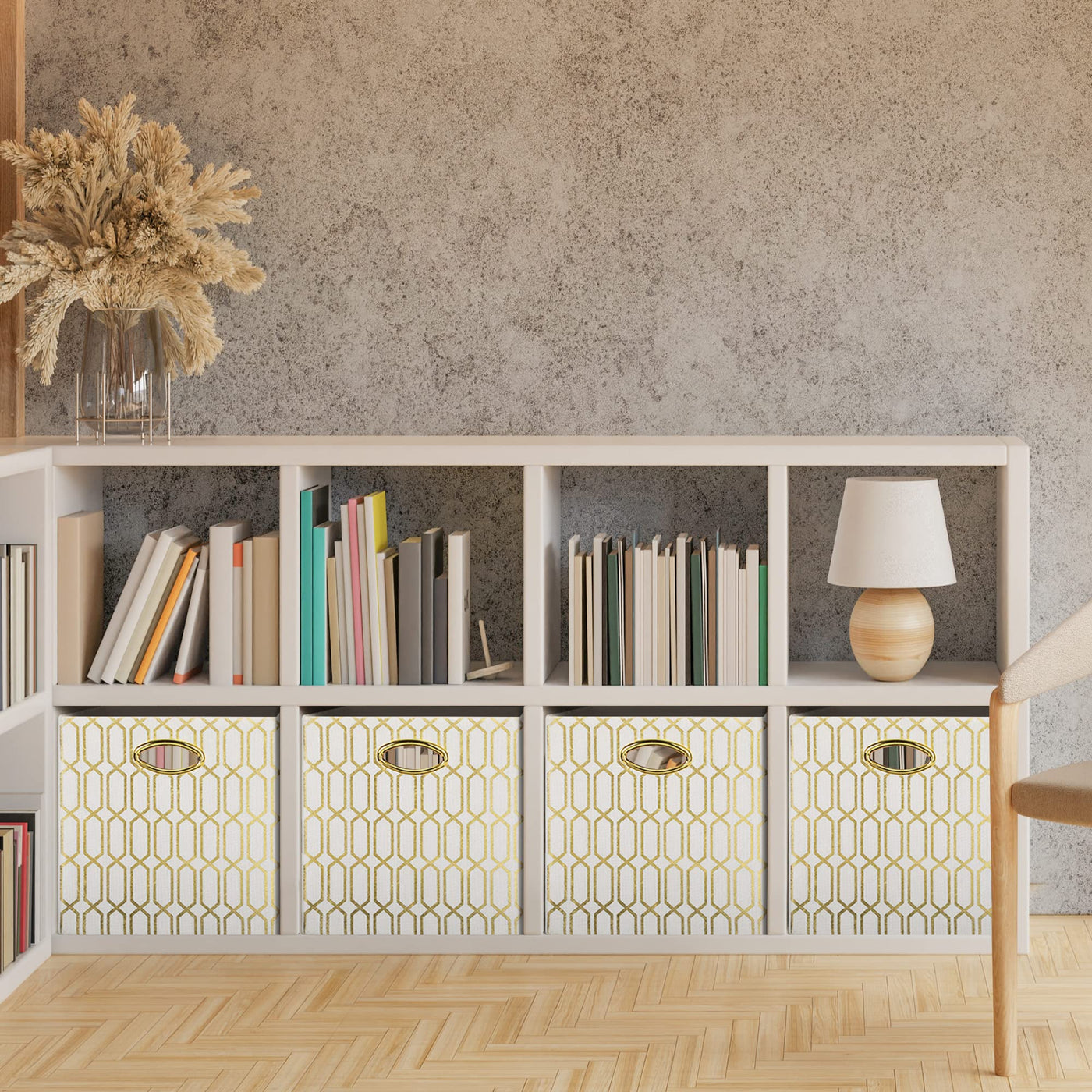 Posprica Storage Bins, Storage Cubes,13 13 Fabric Drawers Organizer Basket Boxes Containers (13 13 13/4Pcs, Cream/Gold Geomet