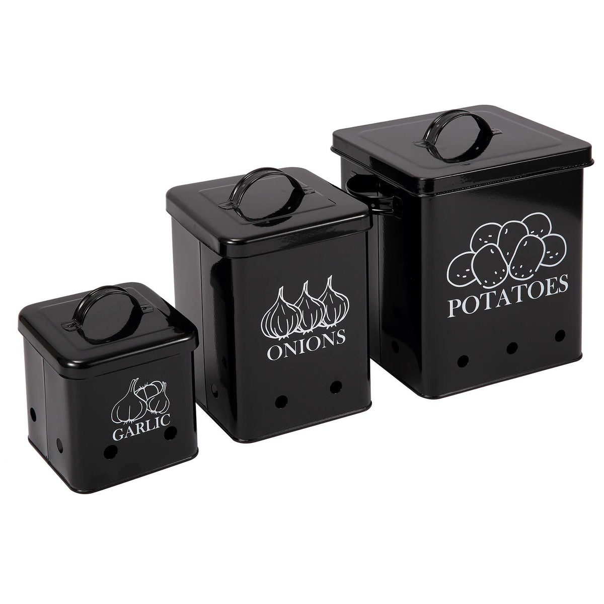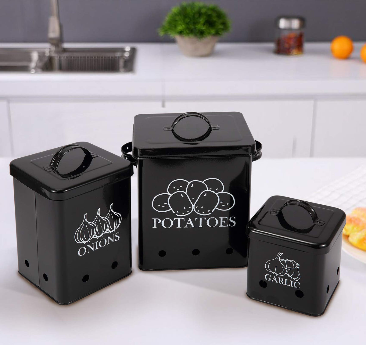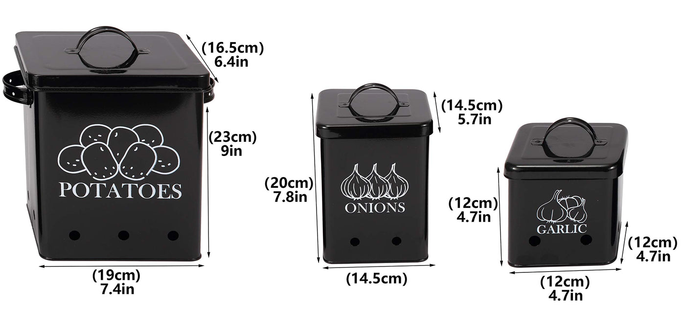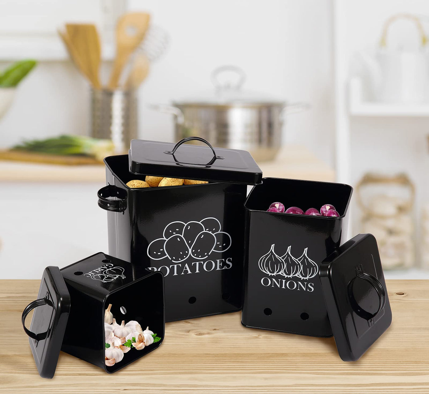 - Q: How many canisters are included in the set? A: The set includes three canisters designed for storing potatoes, onions, and garlic.