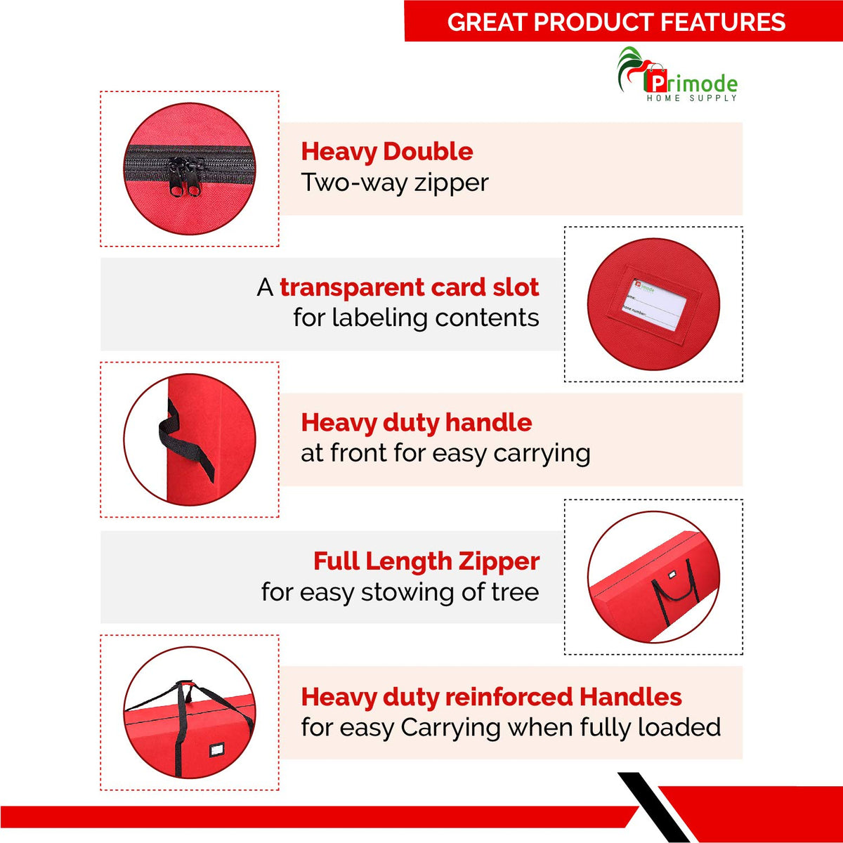 ABOUT PRIMODE TRRE BAG PRIMODE super quality presents a great holiday storage bag to accommodate trees up to 5 feet tall to protect against dust and insects and maintain excellent quality of your keepsakes throughout the year. Its as easy as placing your artificial holiday tree in the bag, zip it up and safely store it away until next year. Its Large enough to hold a 6 foot disassembled Artificial Christmas Tree You will have no problem storing unassembled artificial trees. The Tree Storage Bag comes with sturdy carry handles for easy transporting of your tree. Heavy Duty Full Length Zipper No assembly required, Also comes with an outside front zippered pocket, includes Plastic tag compartment on side, just unpack, unfold, and insert your tree. Folds flat when not in use This versatile bag can also be used to store a variety of Christmas ornaments, garland, lights, decorations, and toys. Store this bag in your closet, garage, or attic with confidence. FROM THE MANUFACTURER We offer a wide selection of tree storage bags ranging in size, color and finishes so you can be sure to find one that fits your home and holiday decor perfectly. Our storage bag is Durable and long-lasting, lightweight and tear resistant. Our goal is to be a part of your family traditions for years to come and we stand behind every item that we sell. Primode searches worldwide and putting in the utmost effort to bring the highest standard quality production to you to meet consumers satisfaction
