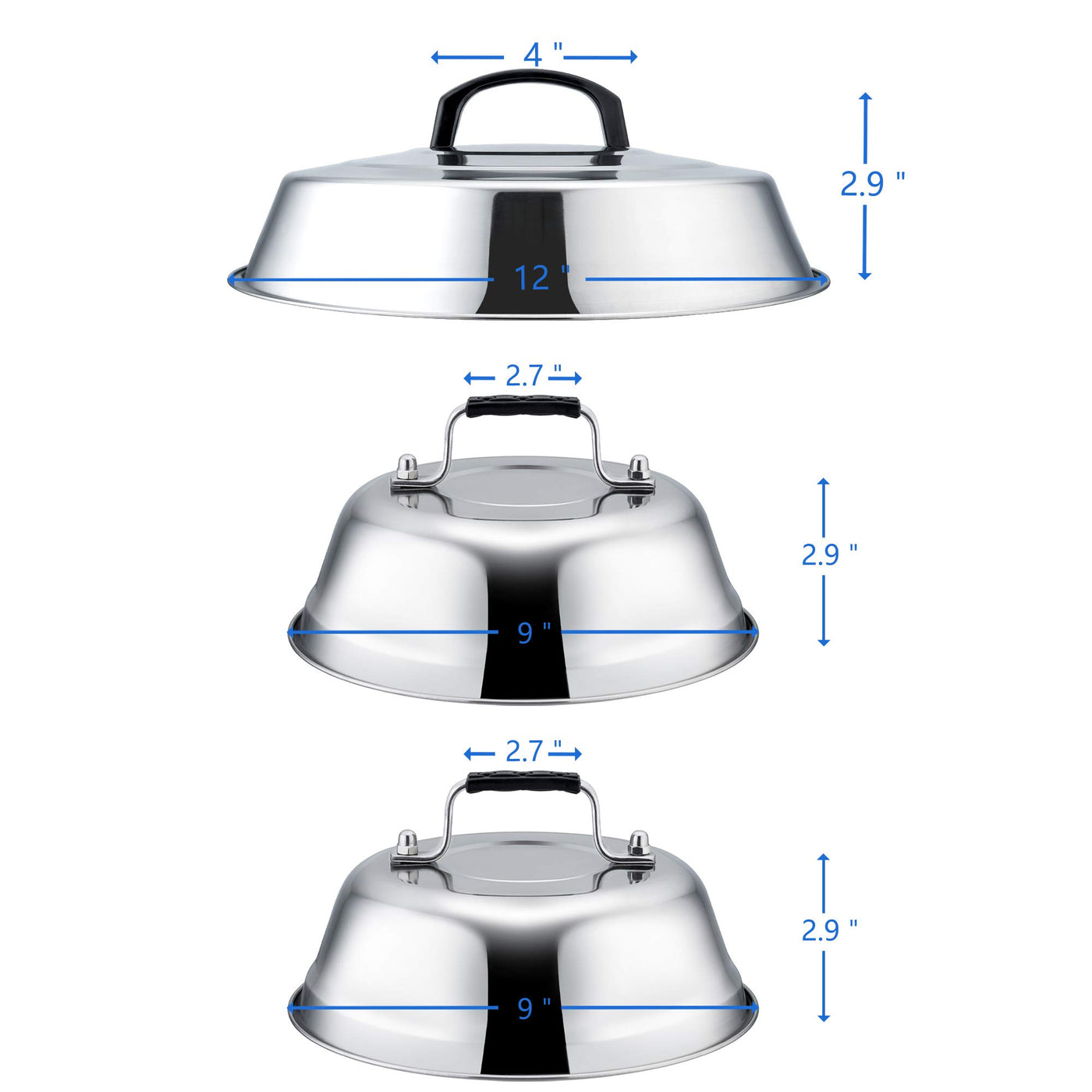 - Q: What are the dimensions of the Professional Melting Dome Lid Set? A: The set includes a 12 inches large burger melting dome with a diameter of 12 inches and a height of 2 inches, and a 9 inches standard grill basting cover with a diameter of 9 inches and a height of 2.9 inches.