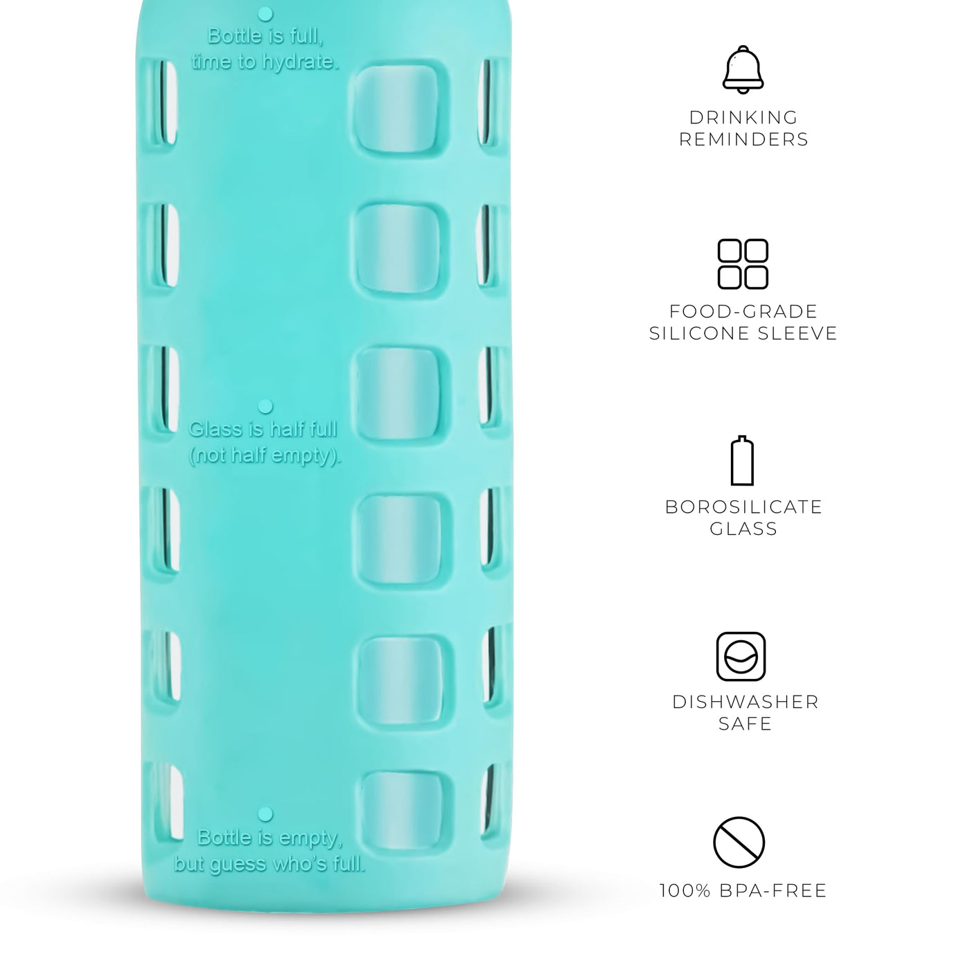 purifyou Premium 40/32 / 22/12 oz Glass Water Bottles with Volume & Times to Drink Silicone Sleeve & Stainless Steel Lid Insert Reusable Bottle for Fridge Water Milk Juice (12oz Aqua Blue)