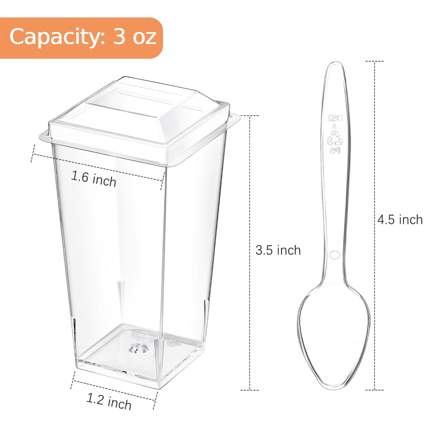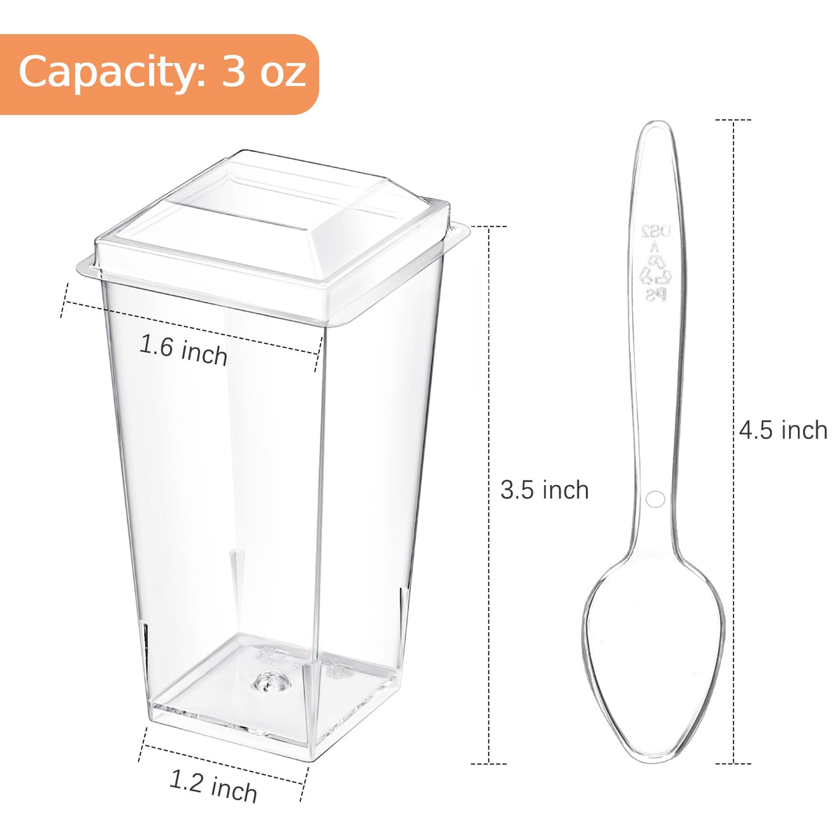 • Q: How many cups, lids, and spoons are included in the package? A: The package includes 50 mini dessert cups, 50 clear plastic lids, and 50 clear spoons.