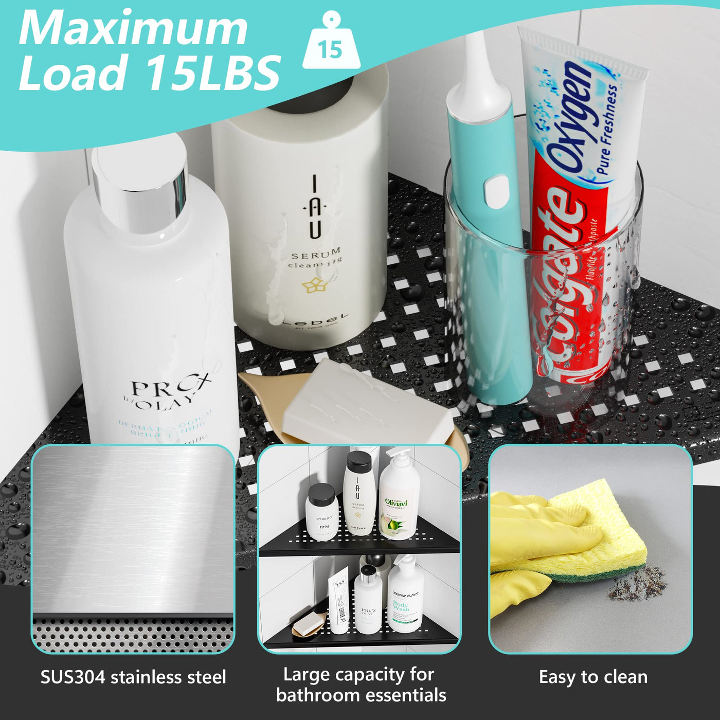 - Q: How much weight can each corner shelf hold? A: Each shower corner shelf can hold up to 15 pounds of shower supplies.
