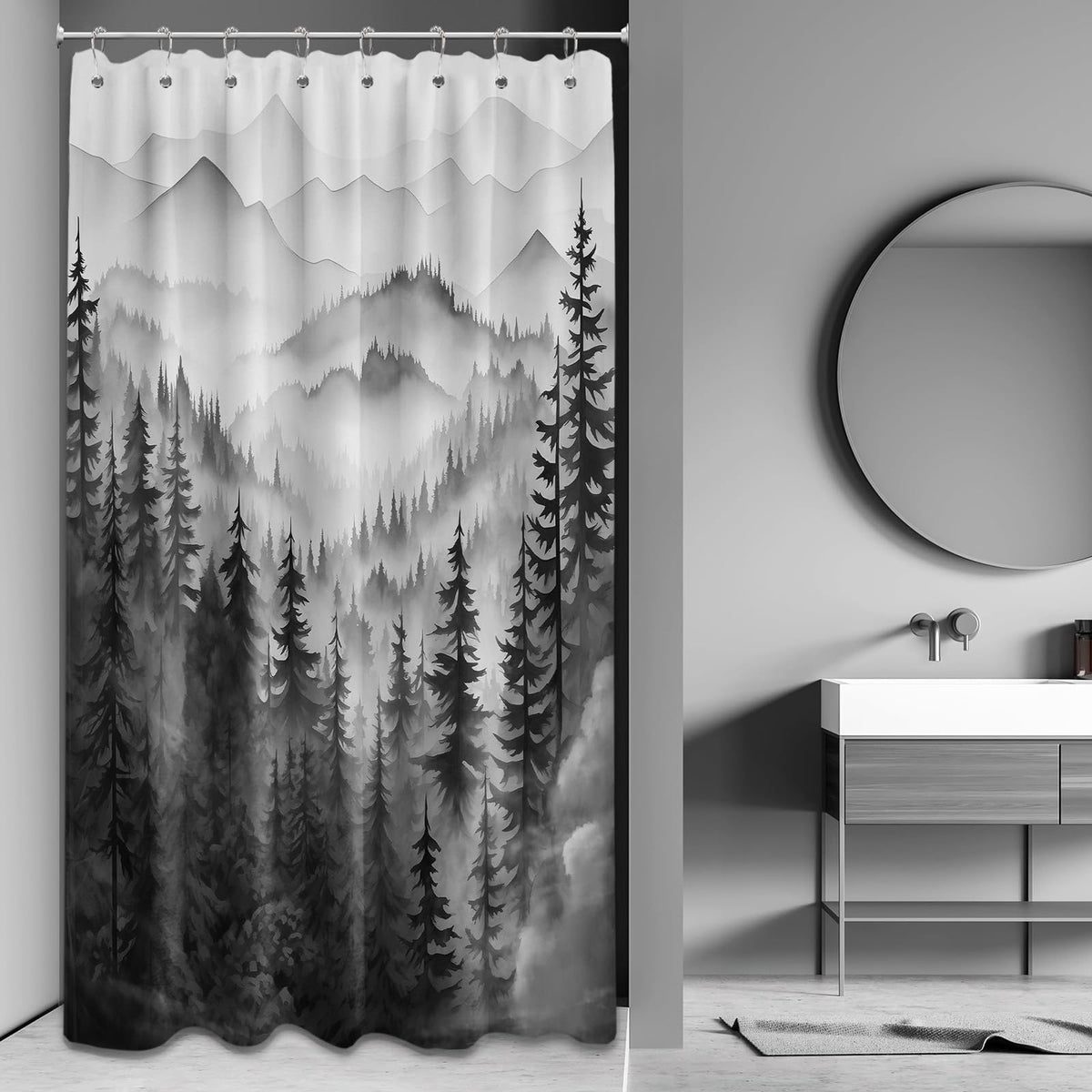 QGHOT Mountain Shower Curtain Black and White Forest Nature Shower Curtains for Mens Bathroom Charcoal Grey Rustic Woodland Pine