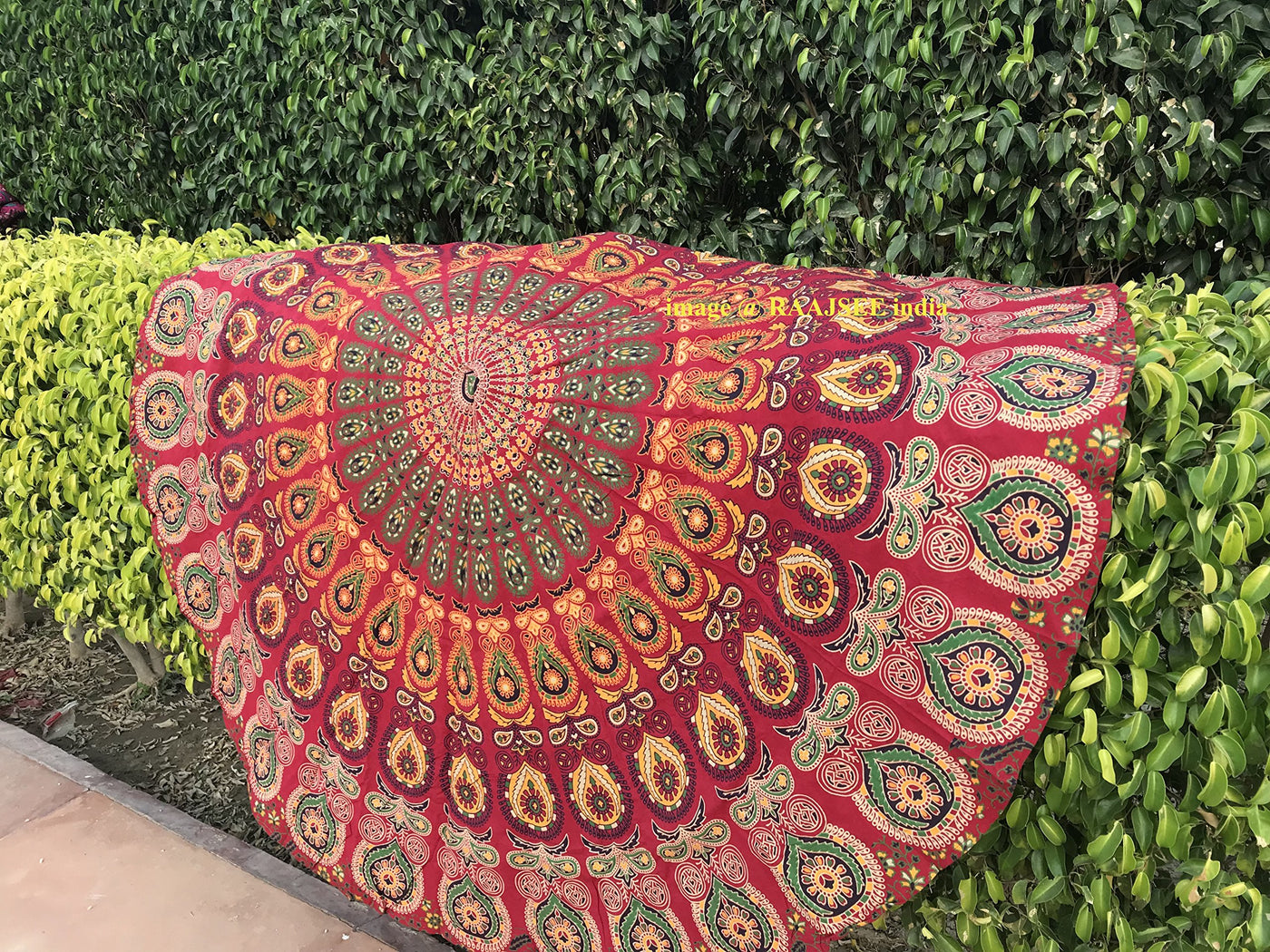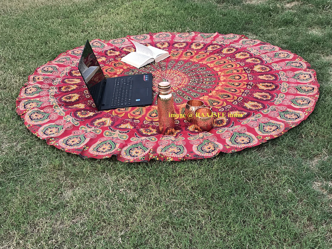 raajsee Red Mandala Round Beach Tapestry Hippie/Boho Beach Blanket Roundie/Indian Cotton Throw Bohemian Round Table Cloth/Yoga Mat Meditation Picnic Rugs 70 inch Circle