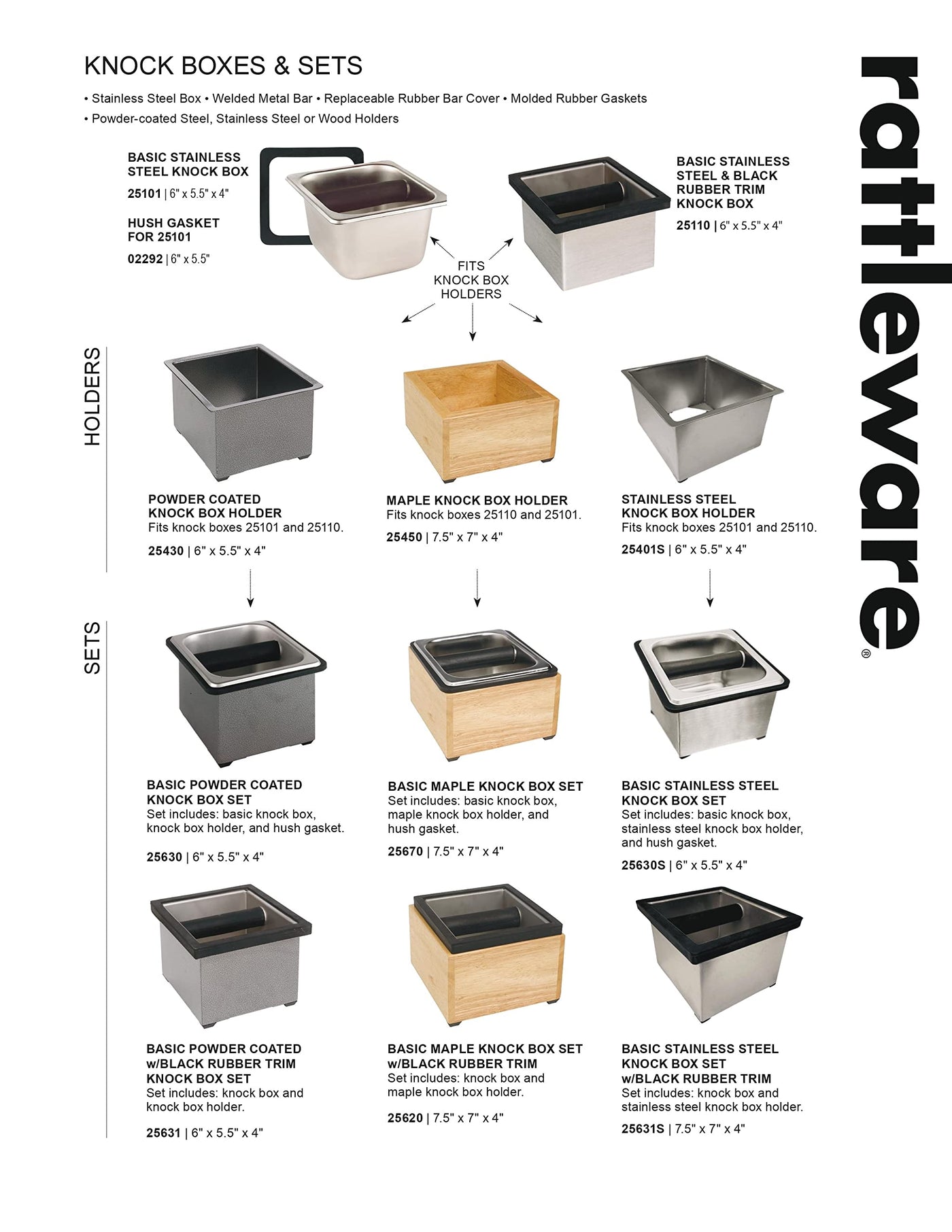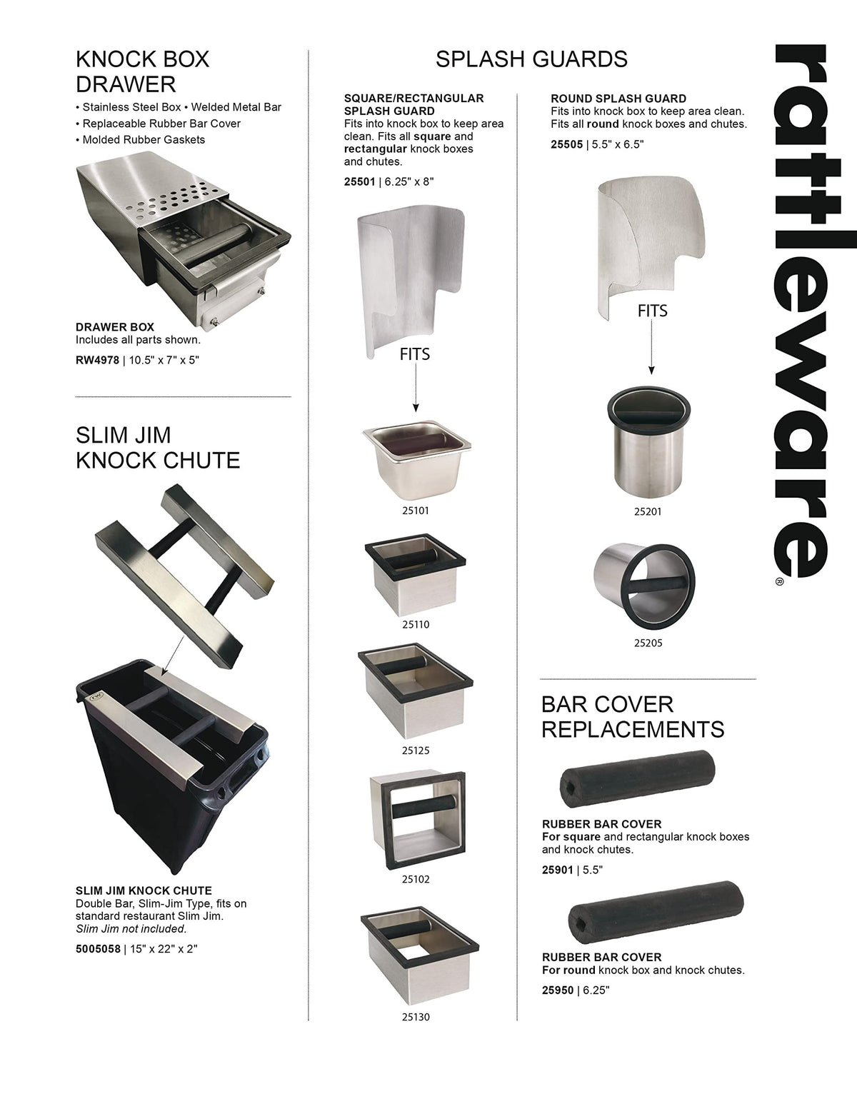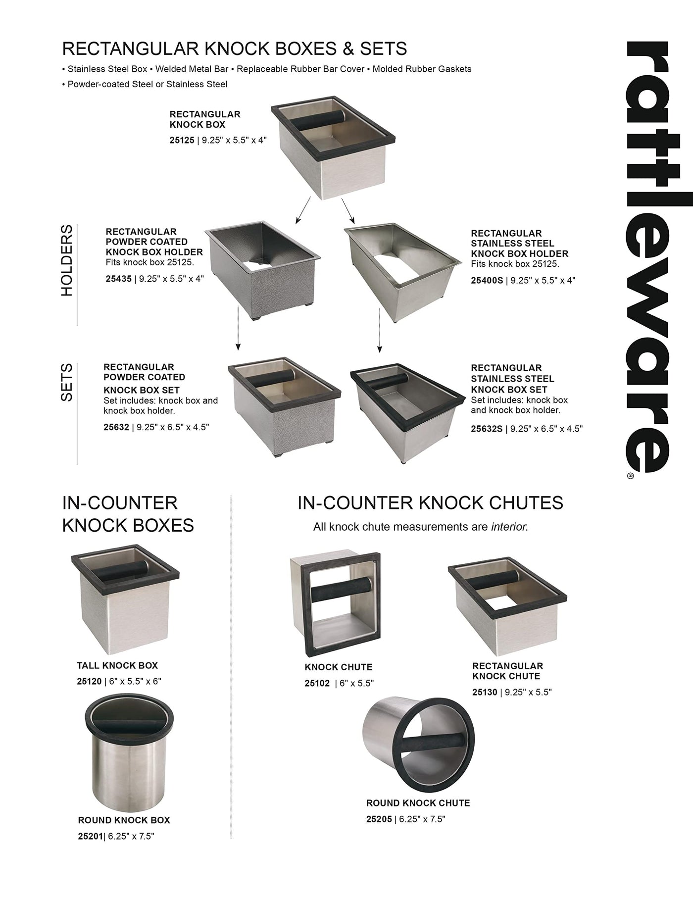 • Q: What materials is the Rattleware Knock Box Chute made from? A: The Rattleware Knock Box Chute is constructed entirely from stainless steel, ensuring durability and long-lasting quality.
