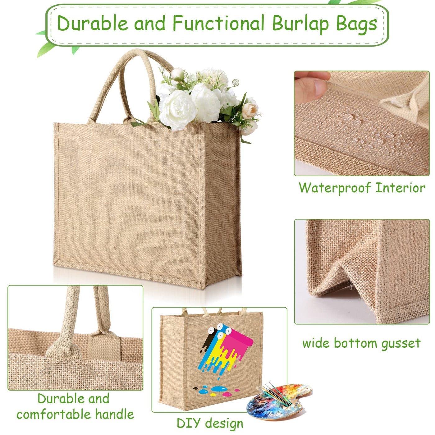 • Q: What are the dimensions of the jute tote bags? A: Each jute tote bag measures approximately 15.35 x 12.2 x 5.91 inches, providing ample space for carrying various items.