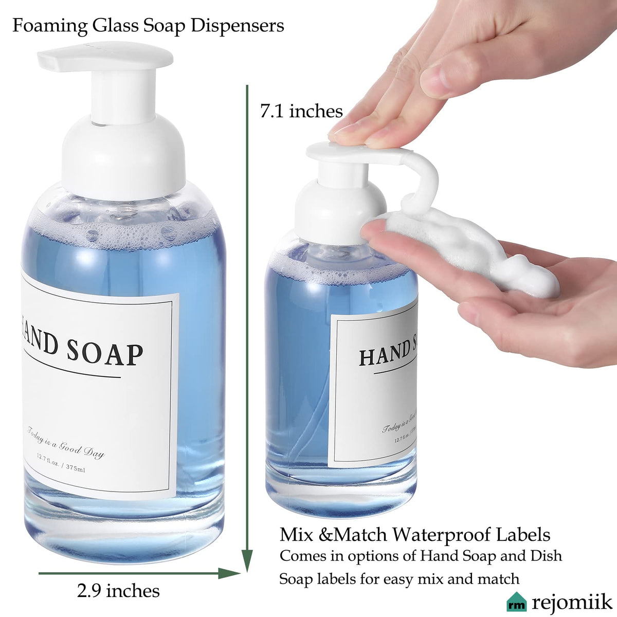 rejomiik 2 Pack Foaming Soap Dispenser Thick Glass Foam Hand Soap Dispenser for Bathroom or Kitchen Sink 13 oz Clear Pump Bottles for Hand soap Body Wash White