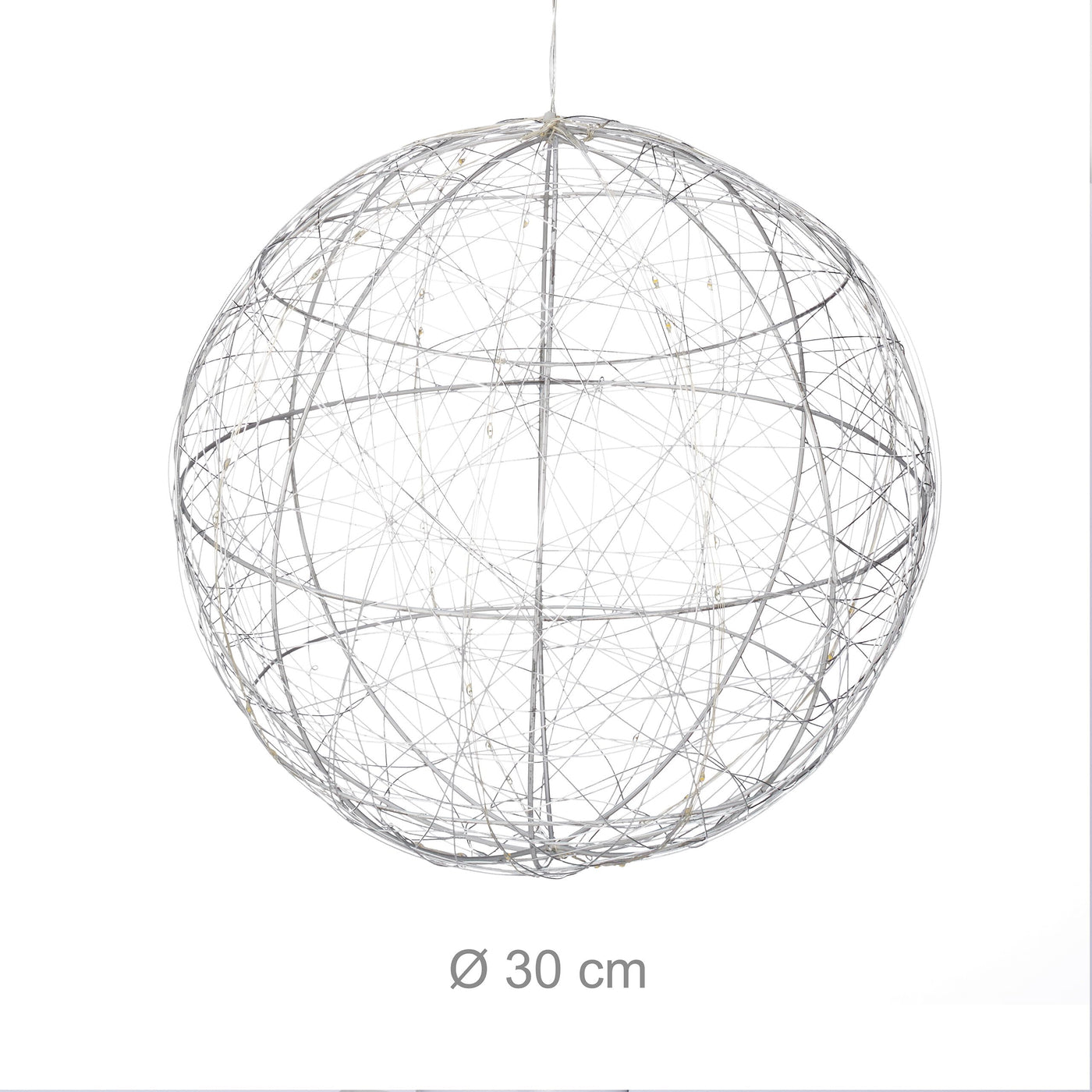 The decorative globe with warm white LED lighting creates a cosy and homely atmosphere. Whether you hang it in a window, place it on a windowsill or table, or place it on the floor, the Light Ball is a great eye-catcher. Even when switched off, the modern silver wire design is beautiful to look at. The round shape is timeless and ensures that the light object not only looks good at Christmas, but can also be used all year round.LED Light Sphere in Detail- Diameter: approx. 30 cm- Cable length: approx. 3 m- Weight: approx. 350 g- Material: Iron, copper- Colour: Silver- 3 AA batteries required (not supplied)Decorative Light for Indoor Use- Hang up or stand up- Great for window decoration, wall or door etc.- Battery powered for flexible placement- Use as Christmas decoration or all year round- Modern design with warm white LEDs- Small decorative diamonds for added interest- Automatic function - switches off after 6 hoursIncluded in Delivery- 1x LED window decoration- Decorative items and batteries not included