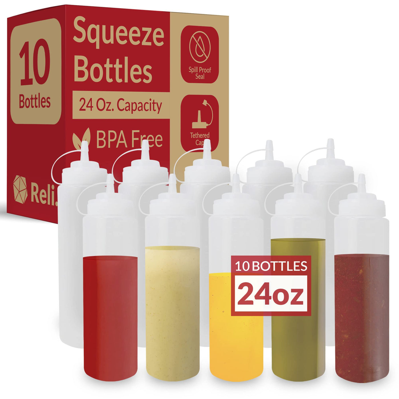 Reli. Plastic Squeeze Bottles, 24 Oz. | 10 Pack | Condiment Squeeze Bottles For Sauces | Clear W/Tethered Caps | 24 Ounce Hot Sa