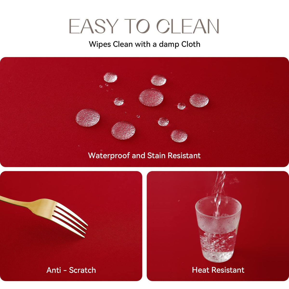 • Q: Is the tablecloth waterproof? A: Yes, the tablecloth is made from 100% polyester that is specially treated to be waterproof and stain resistant.