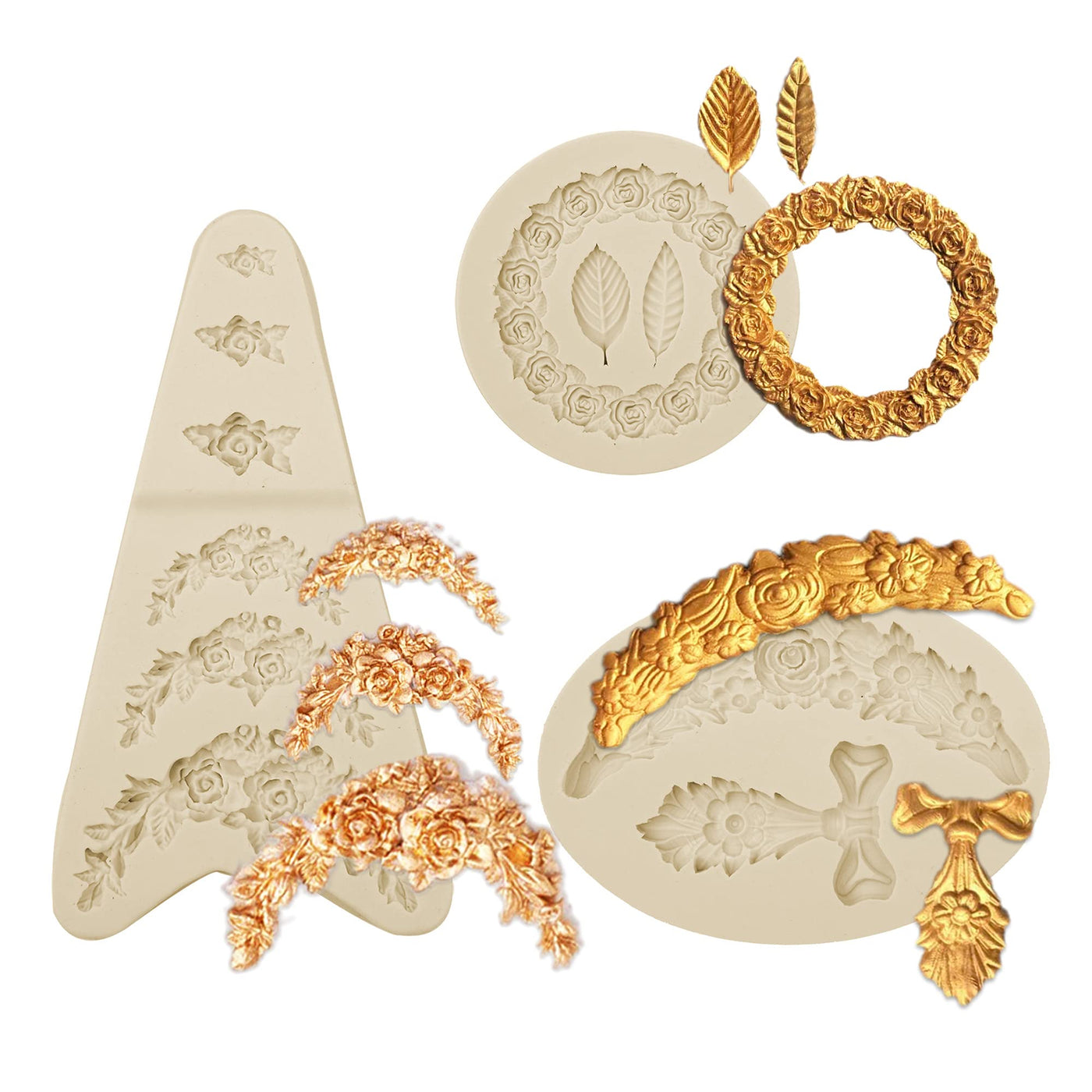 • Q: How many molds are included in the set? A: The set includes three molds: one rose wreath mold and two flower molds.
