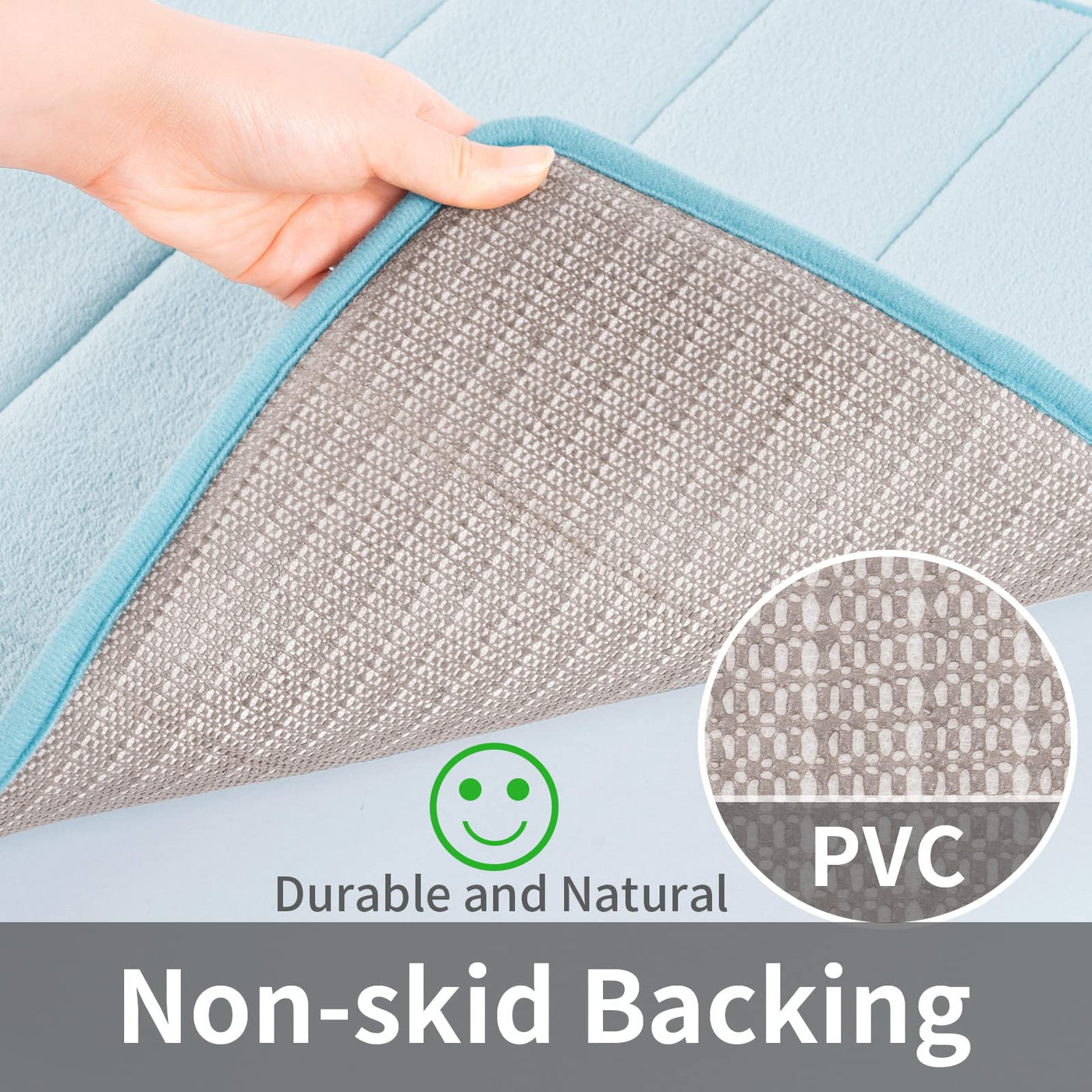 • Q: What material is the bath mat made from? A: The bath mat is made from memory foam with a coral velvet feel microfiber top layer and a durable PVC backing.