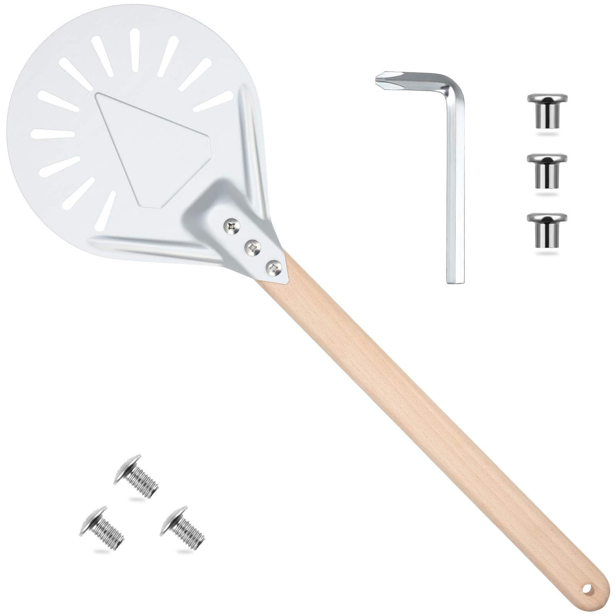 Round Perforated Pizza Peel Non-slip Durable Aluminum Turning Peel Pizza Paddle with 16 Inch Anti-Scalding Wooden Handle for Homemade Pizza Bread Bakers (7 Inch)