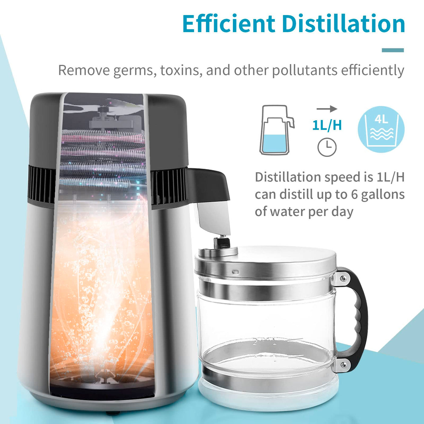 - Q: How long does it take to distill water? A: It takes approximately 4 hours to complete one round of water distillation, producing up to 1 liter of distilled water per hour.