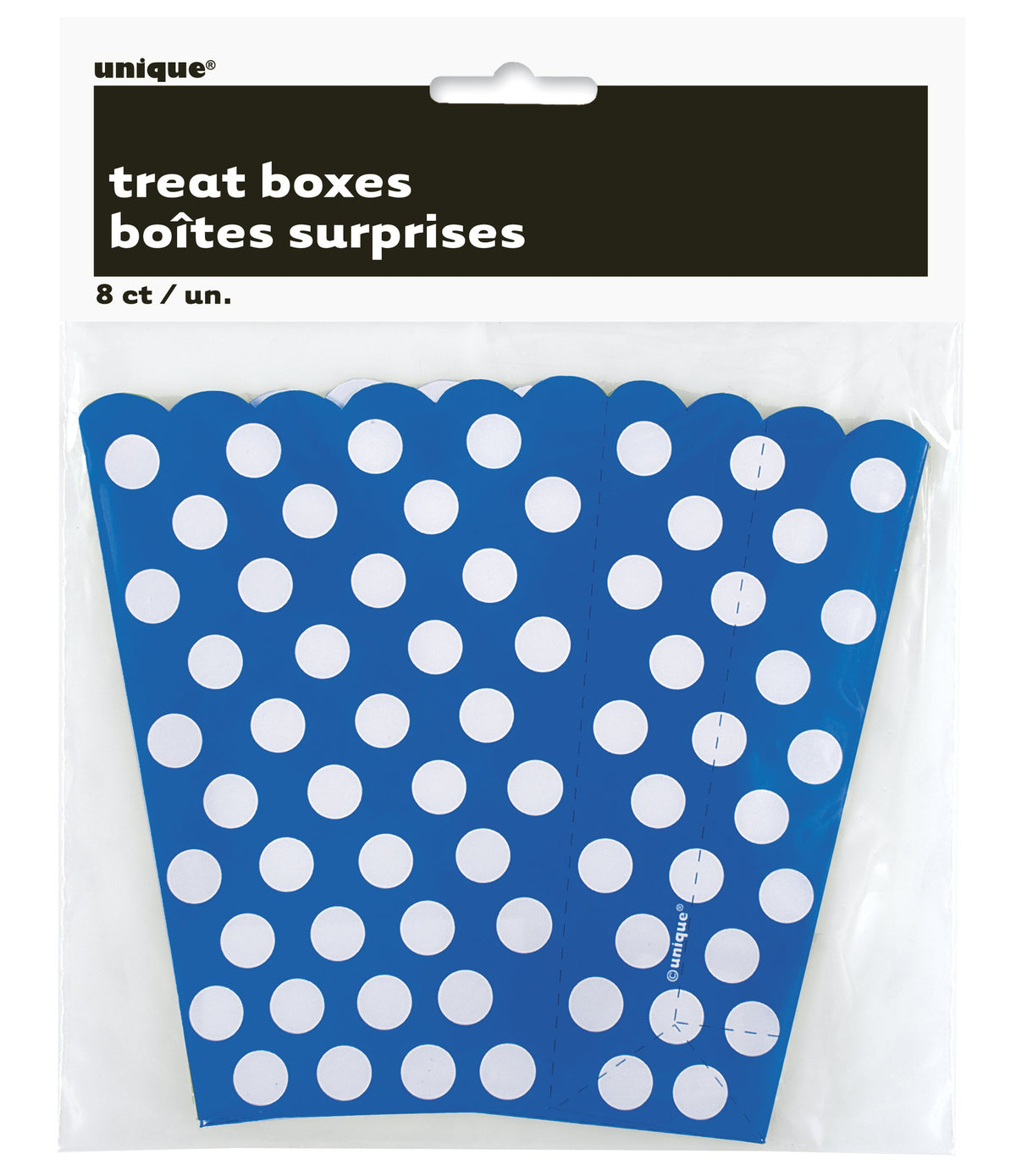 • Q: How many treat boxes are included in a pack? A: A pack of Royal Blue Dots Treat Boxes includes 8 individual boxes.