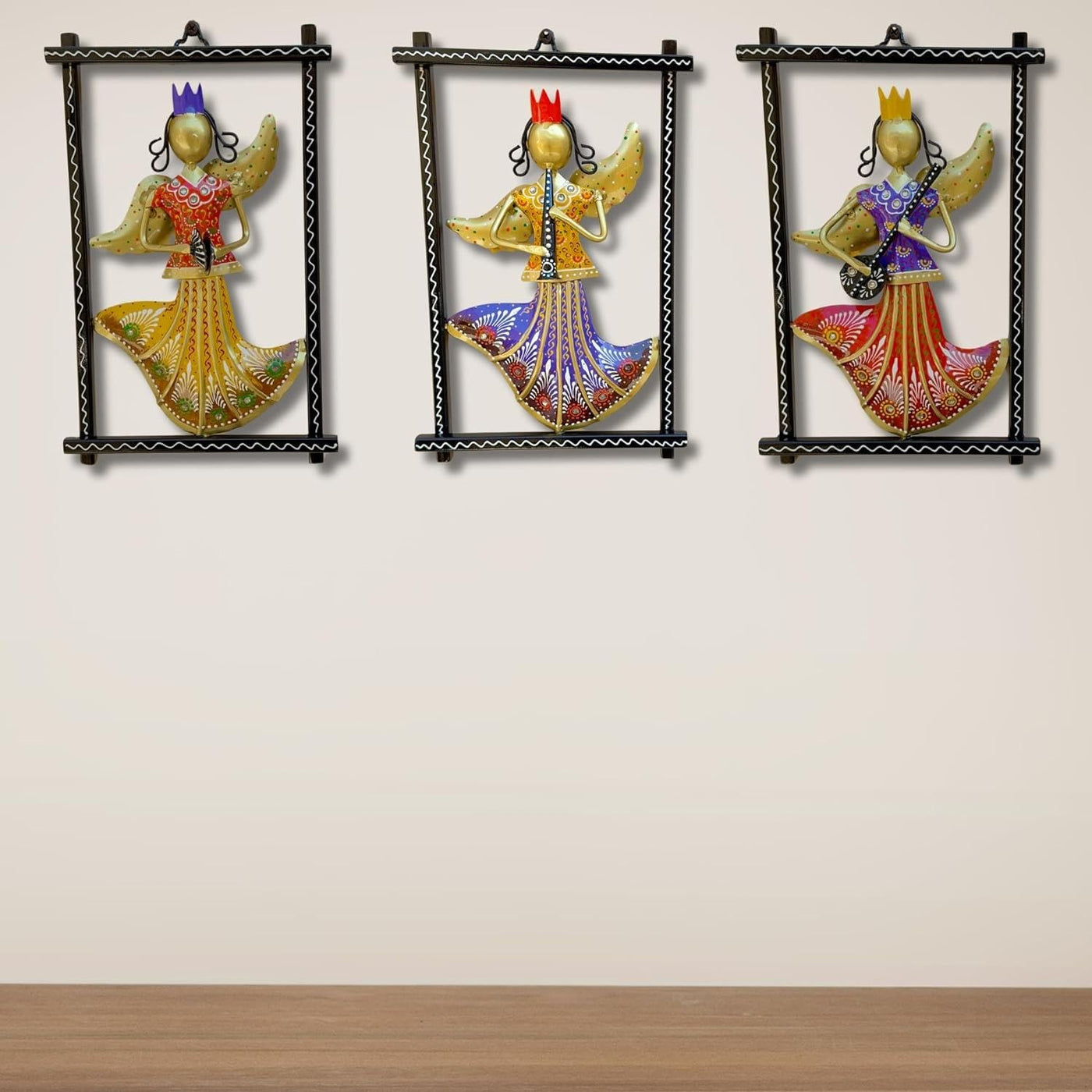 Rsn 3 Rajasthani Pari Musician Wall Hangings For Home Decoration, Metal Wall Art Frame Wall Sculpture For Living Room, Wall Hang