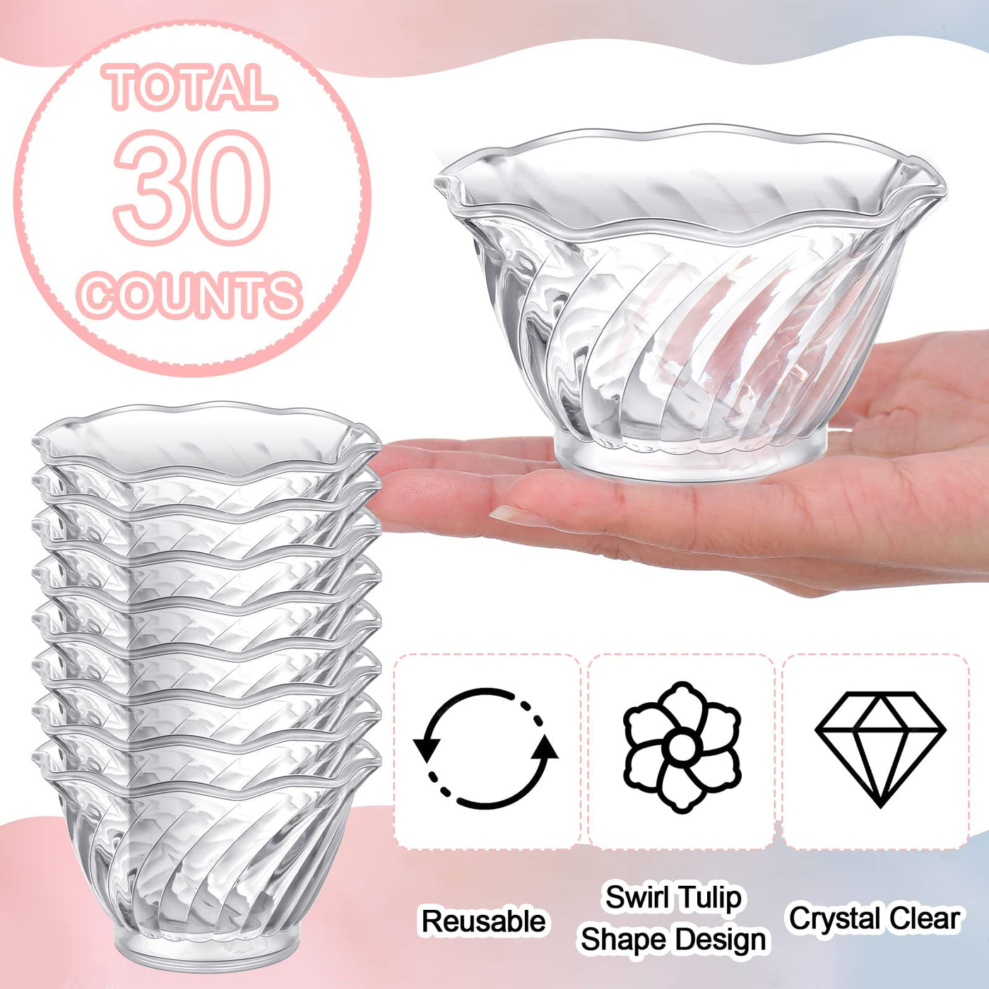 Rtteri 30 Pack Plastic Dessert Cups 6 Oz Clear Ice Cream Sundae Tasting Bowls, Mini Round Swirl Tulip Shape Party Buffet Serving