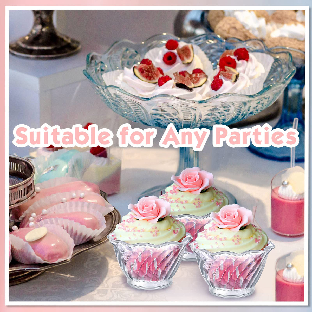 - Q: Are these cups safe for food use? A: Yes, the cups are made of food-safe plastic that is designed for serving various desserts and appetizers.