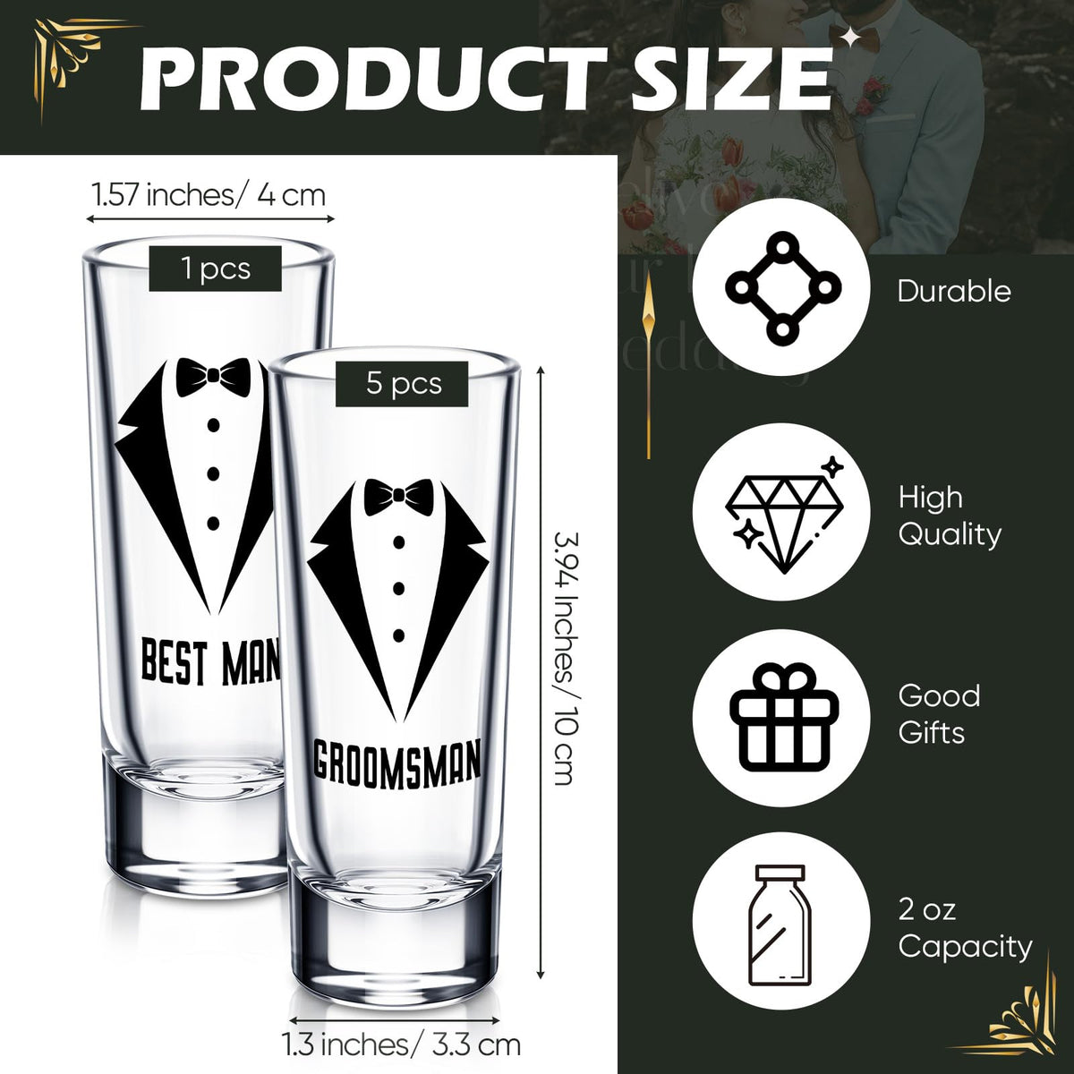 - Q: Do the shot glasses have any design or print on them? A: Yes, the groomsman shot glasses feature clear printing that adds a stylish aesthetic to the glasses.