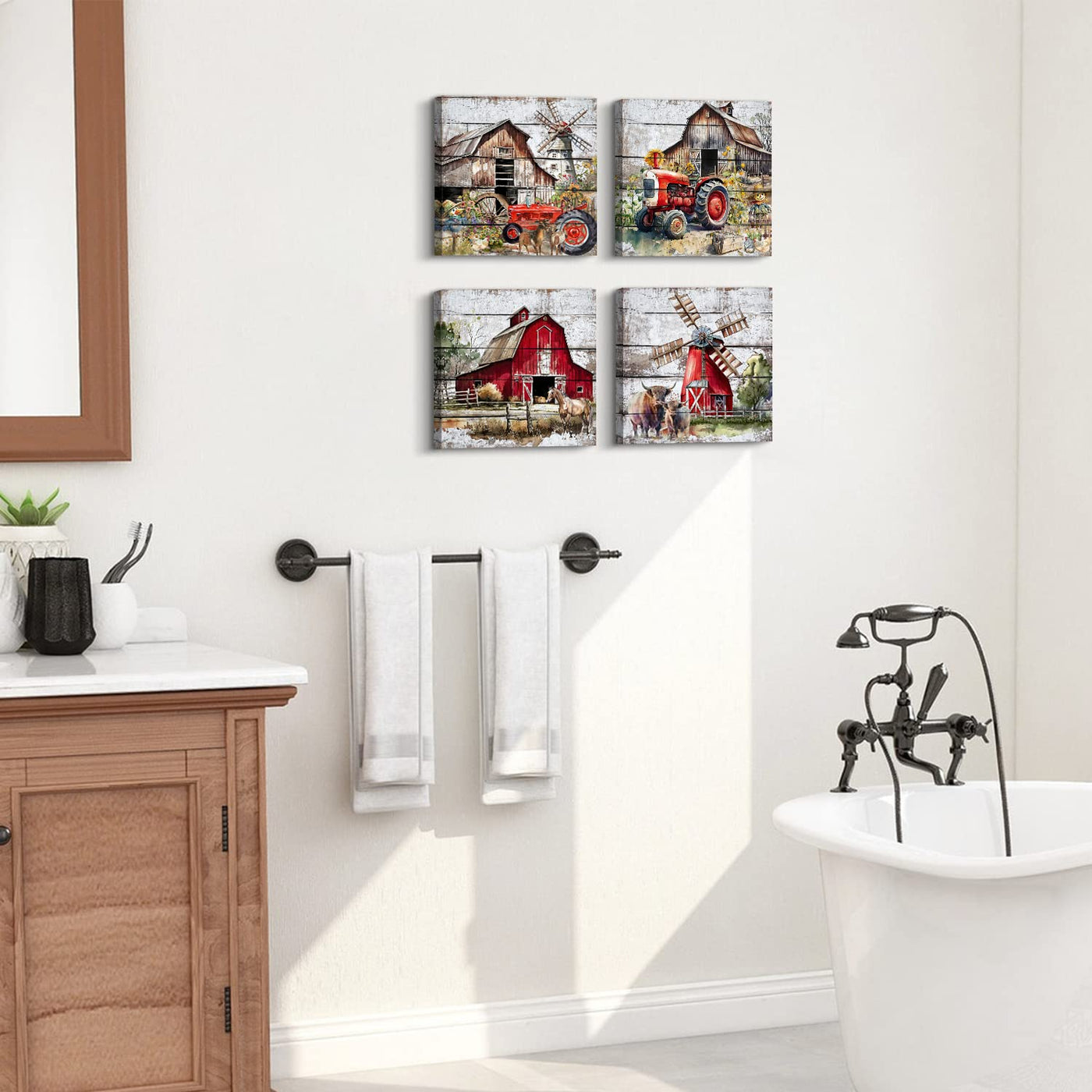 - Q: What are the dimensions of the Rustic Farmhouse Wall Art? A: Each canvas in the Rustic Farmhouse Wall Art set measures 12 inches by 12 inches, and there are a total of four pieces.