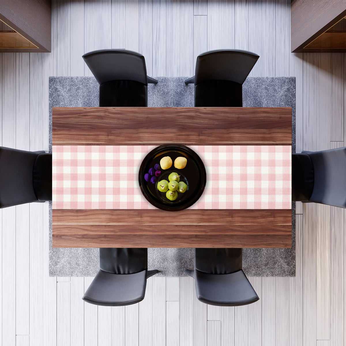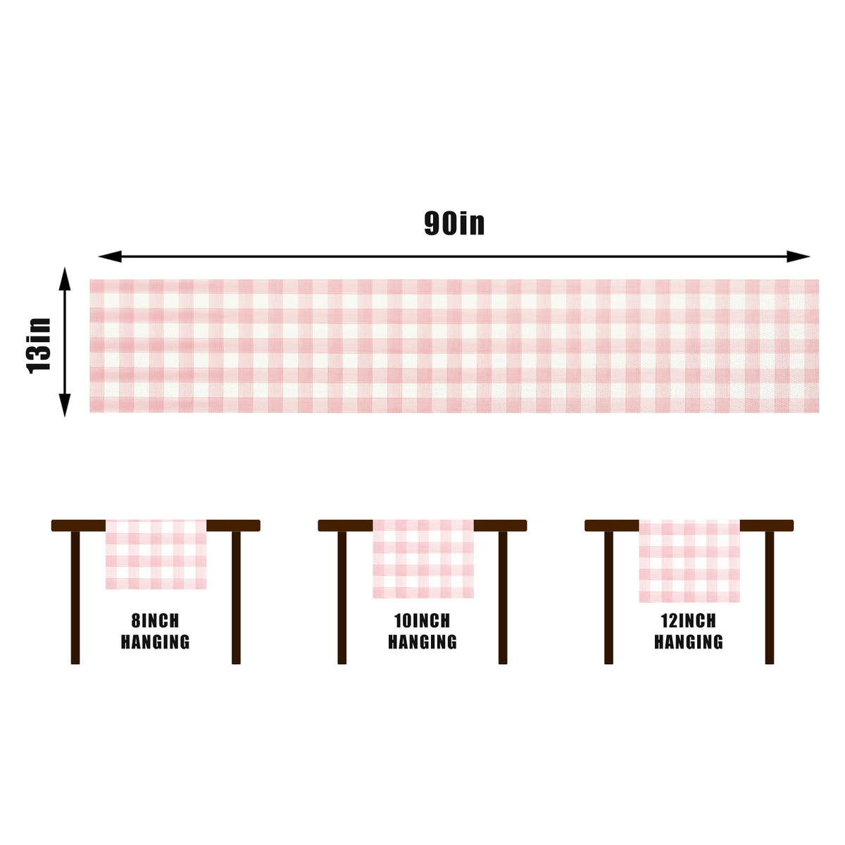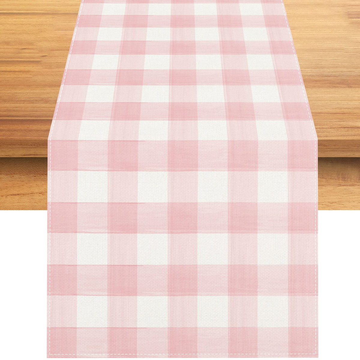 - Q: What color options are available for this table runner? A: The table runner features a watercolor pink and white buffalo check plaid design, giving it a farmhouse aesthetic.