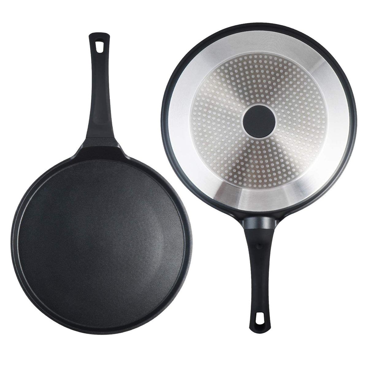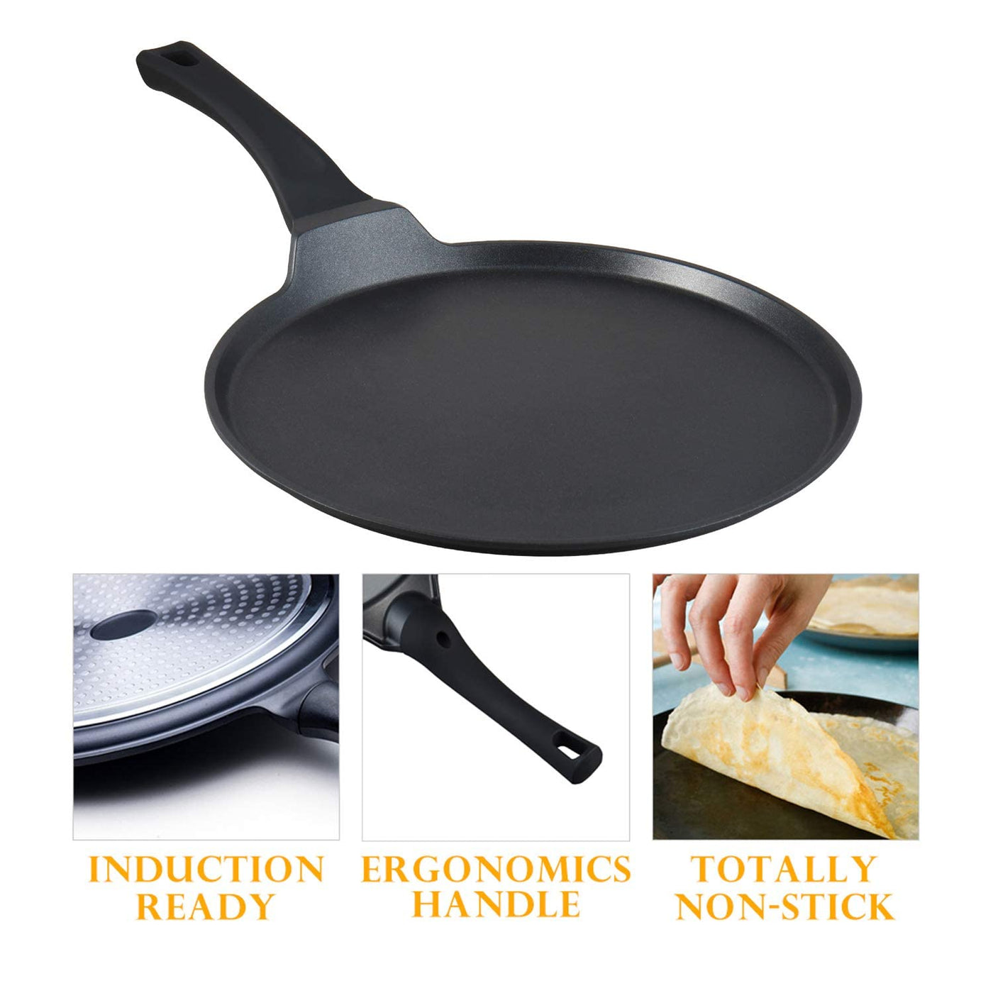• Q: What type of handle does the pan feature? A: The crepe pan features a Bakelite handle design that provides a comfortable grip for easy lifting and transport.